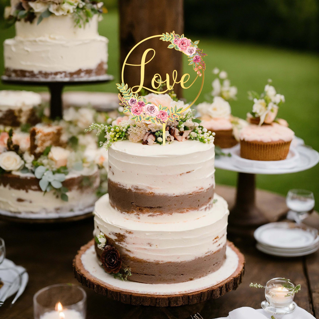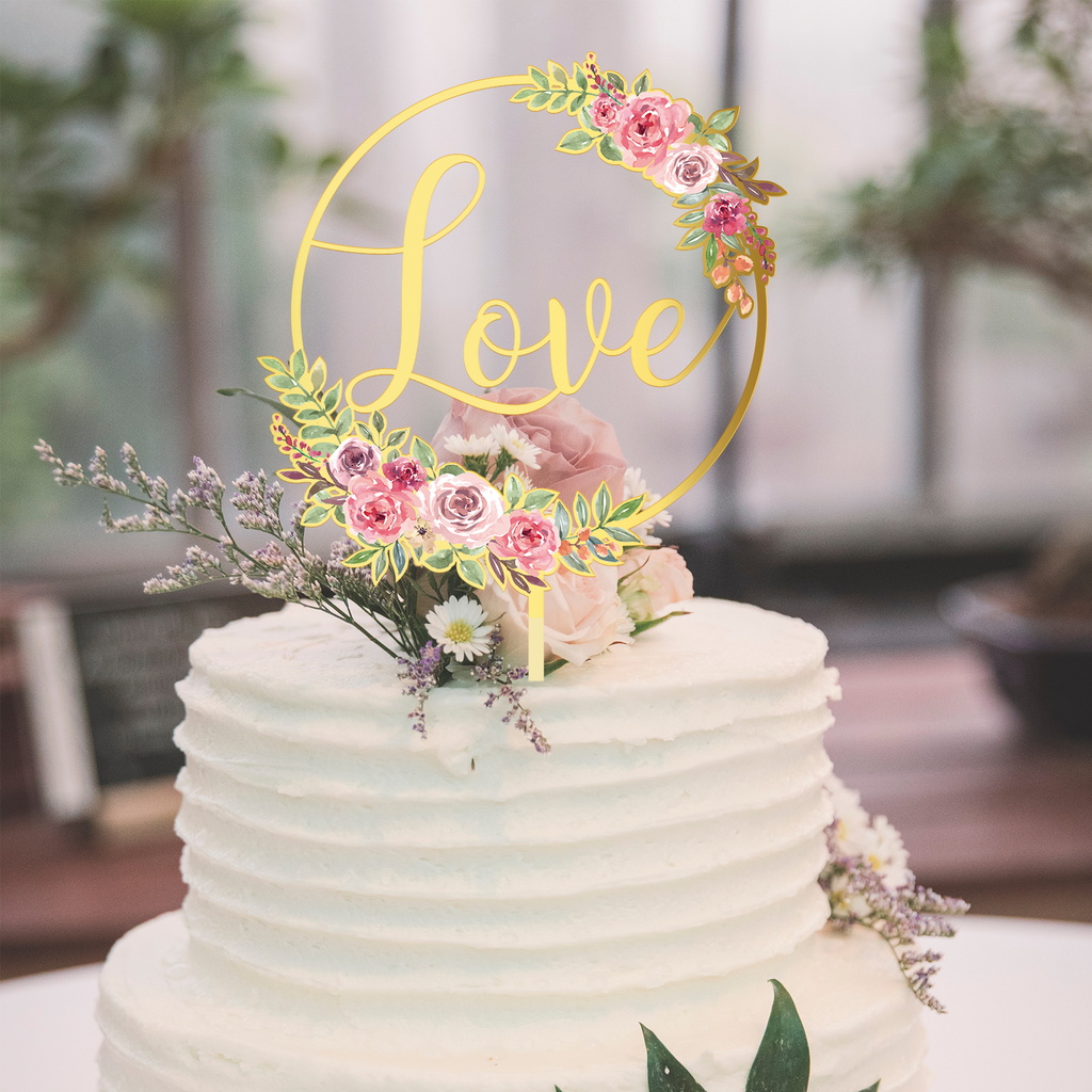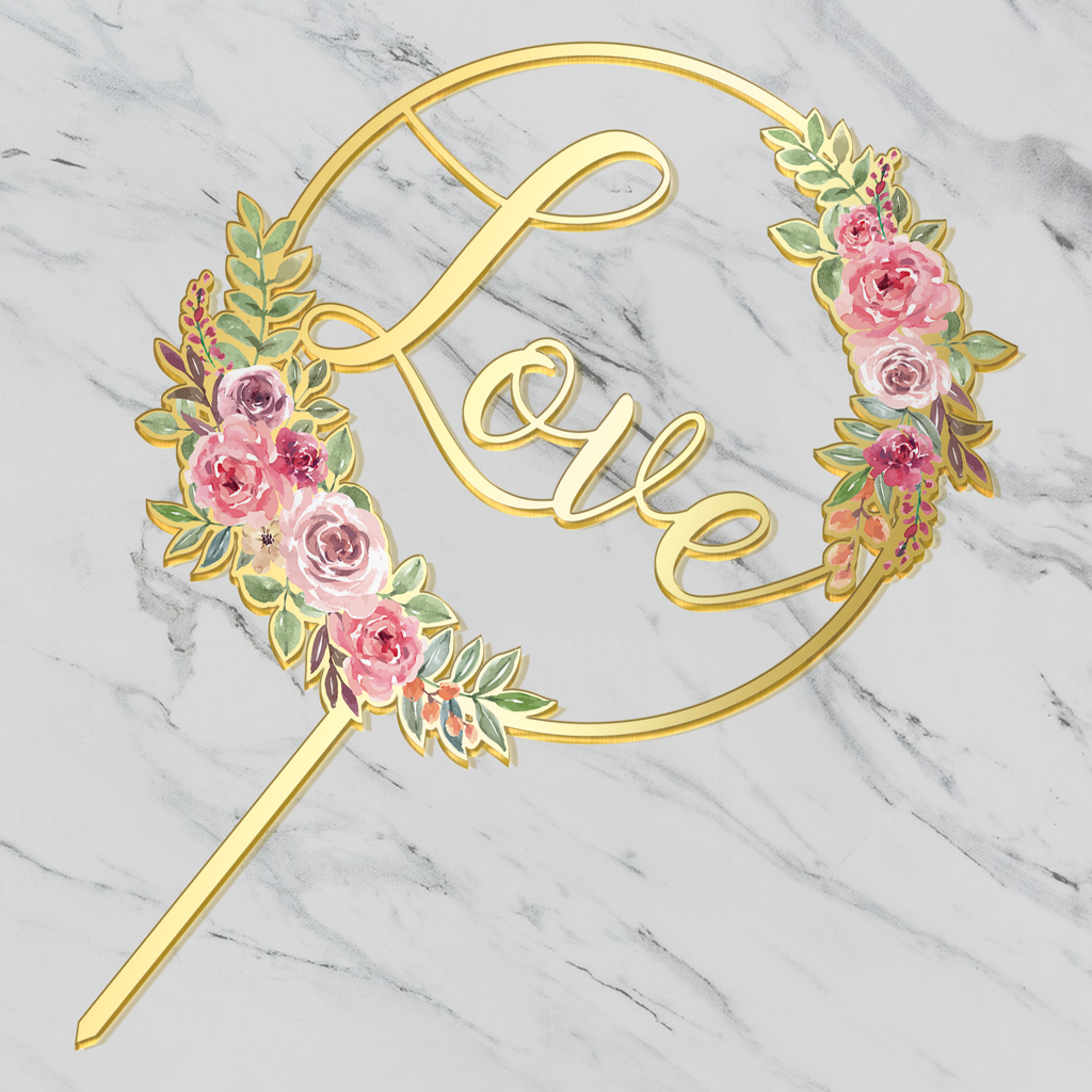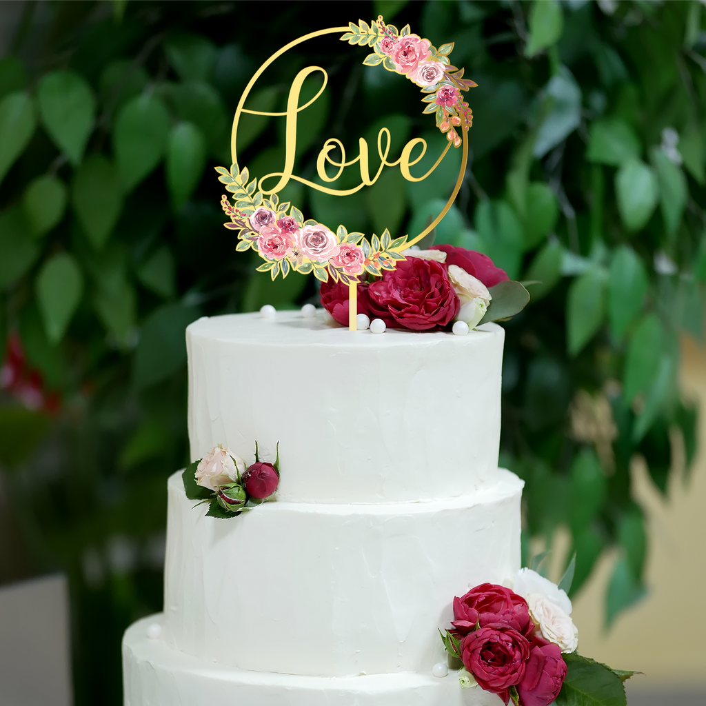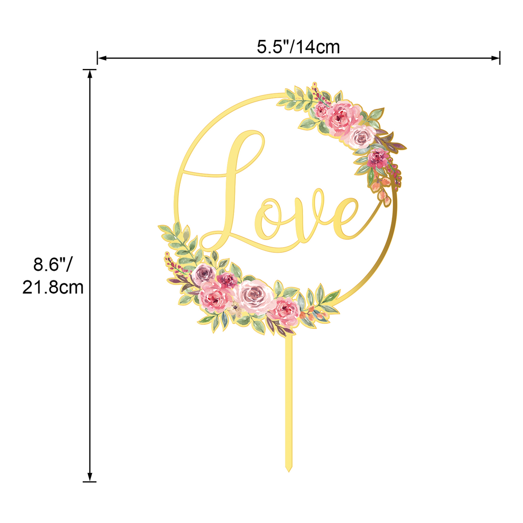 Express your affection with our Love round frame acrylic cake topper with pink floral design, a romantic and elegant centerpiece for your cake. Crafted from premium acrylic, this topper adds a touch of sophistication and sweetness to weddings, engagements, or Valentine's celebrations.