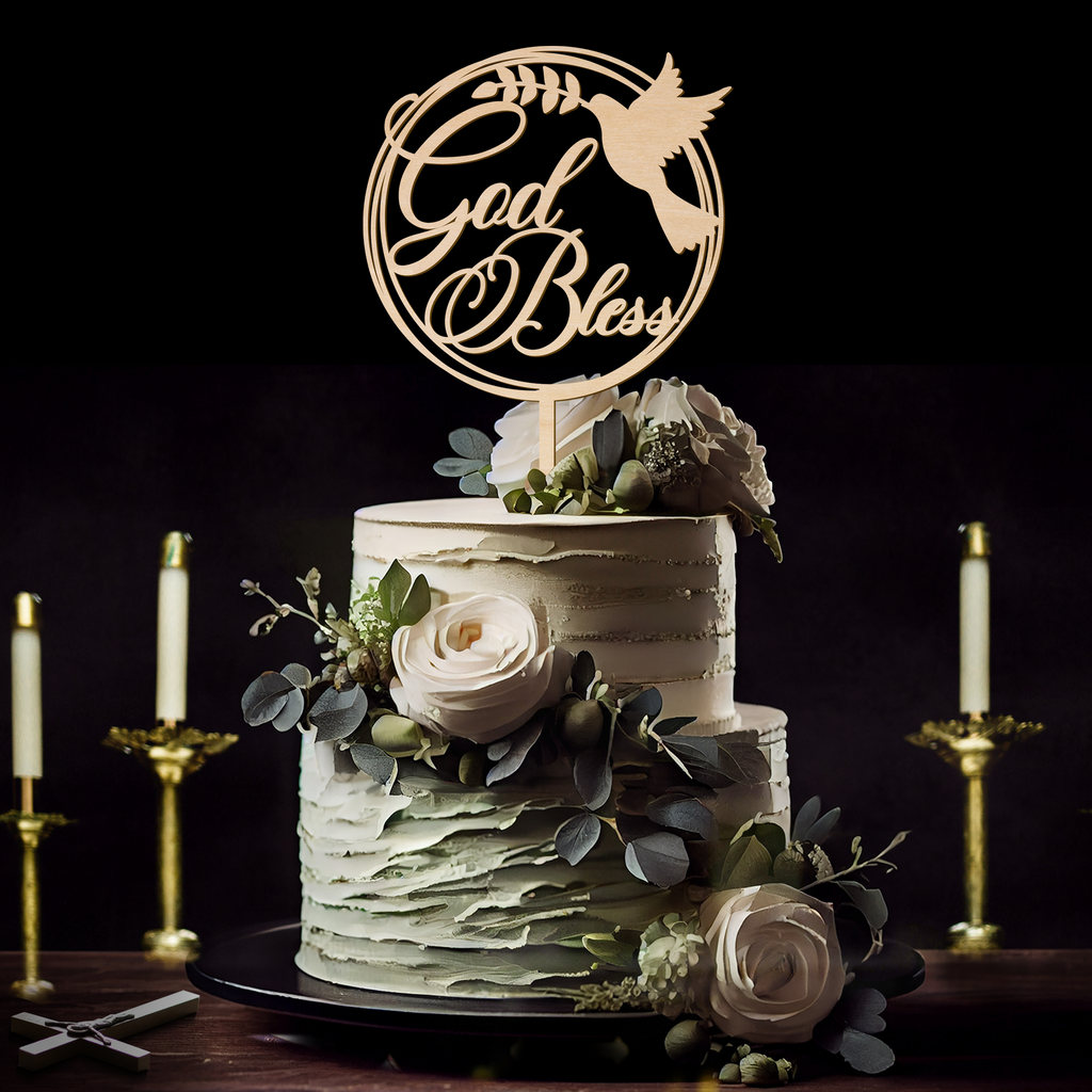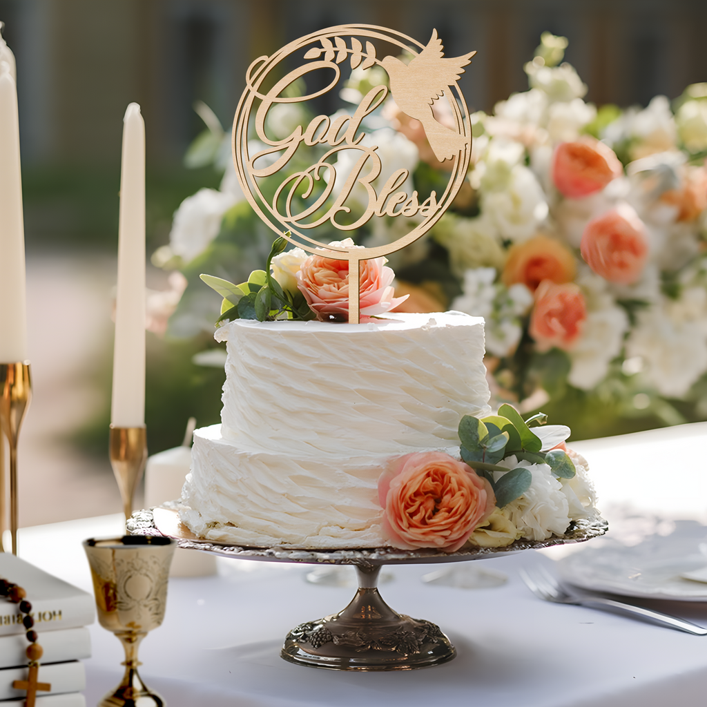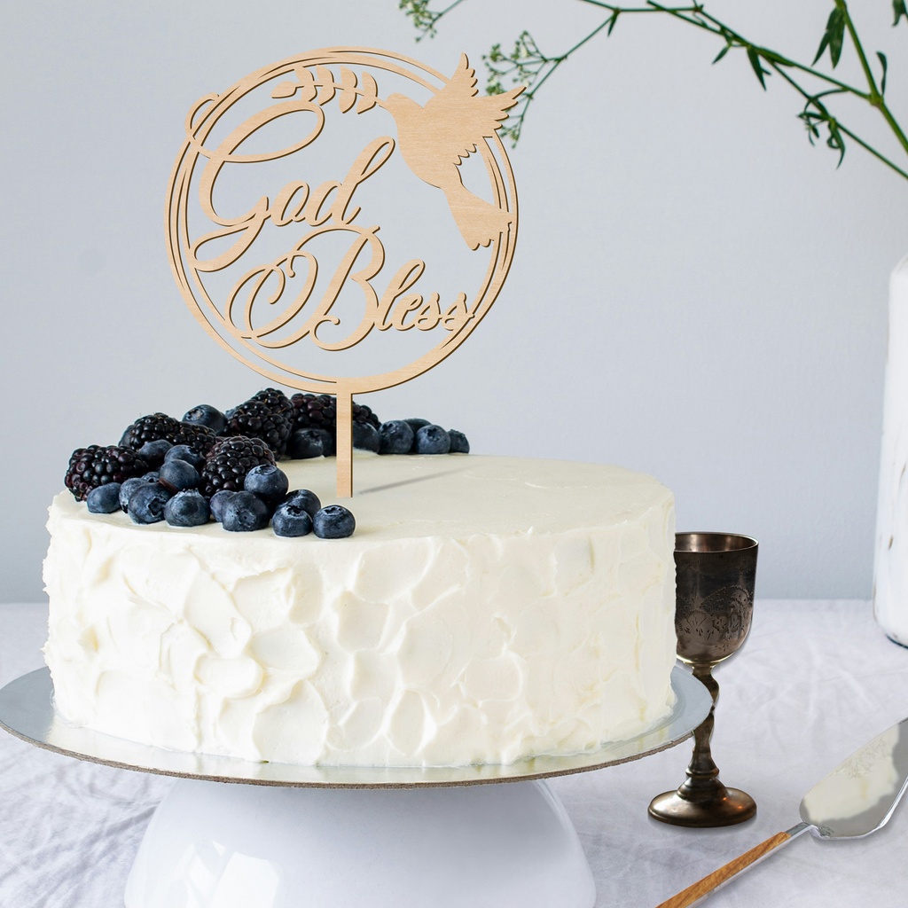 God Bless Baptism Cake Topper in Wood with Dove and Laurel Leaf Design