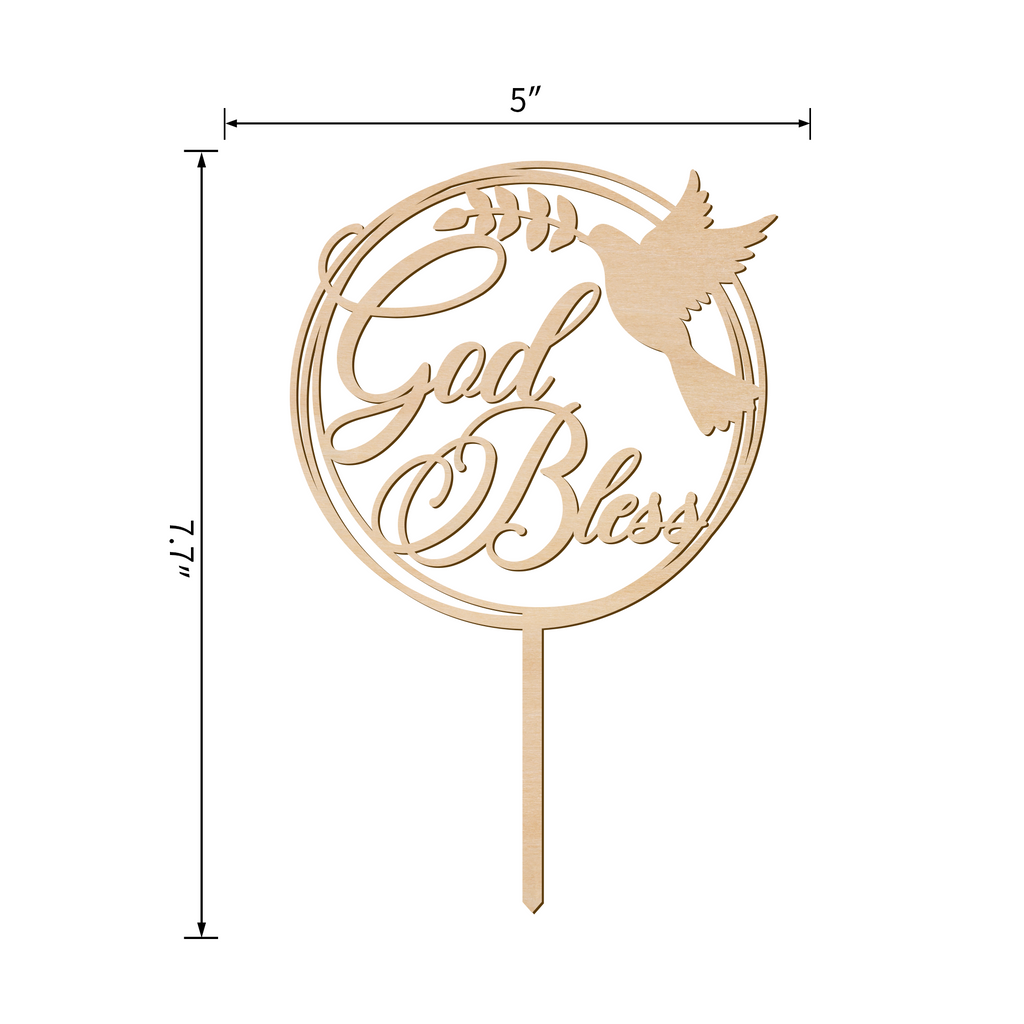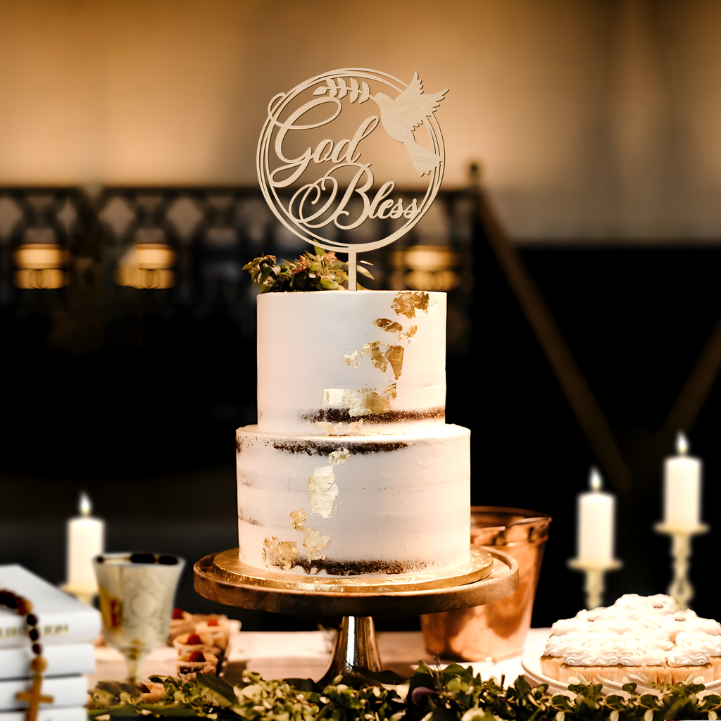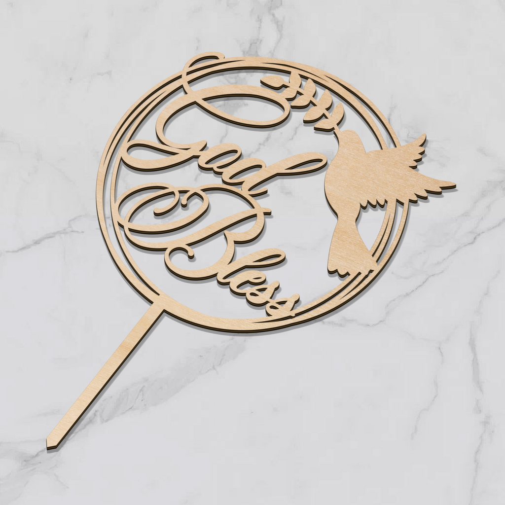 God Bless Baptism Cake Topper in Wood with Dove and Laurel Leaf Design