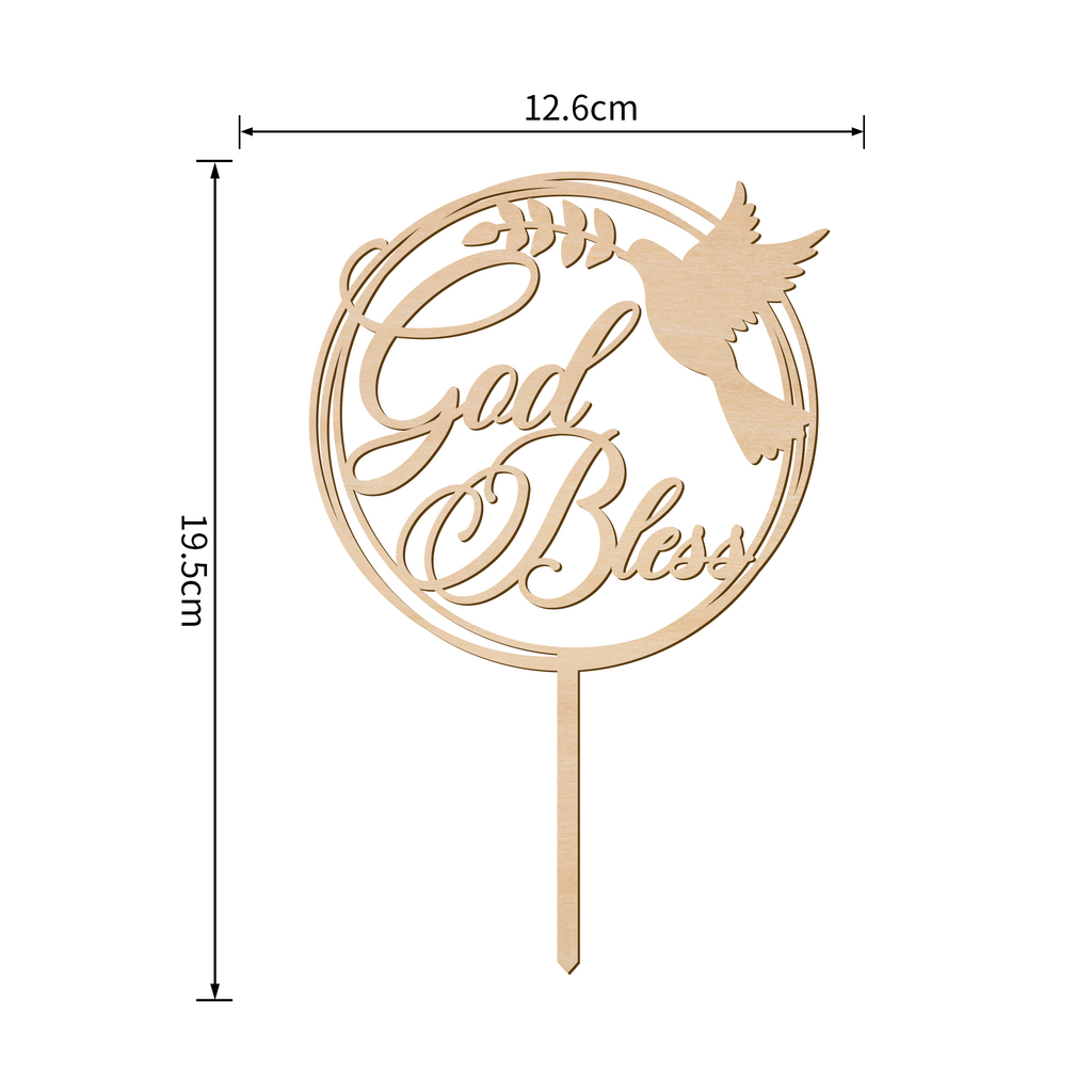 Add a touch of grace to your celebration with our 'God Bless' wooden cake topper with dove and laurel leaf round frame. This beautifully carved piece radiates warmth and faith, making it the perfect addition to religious events like baptisms, communions, or confirmations. Its classic wooden design blends seamlessly with any cake, creating a picture-perfect moment.