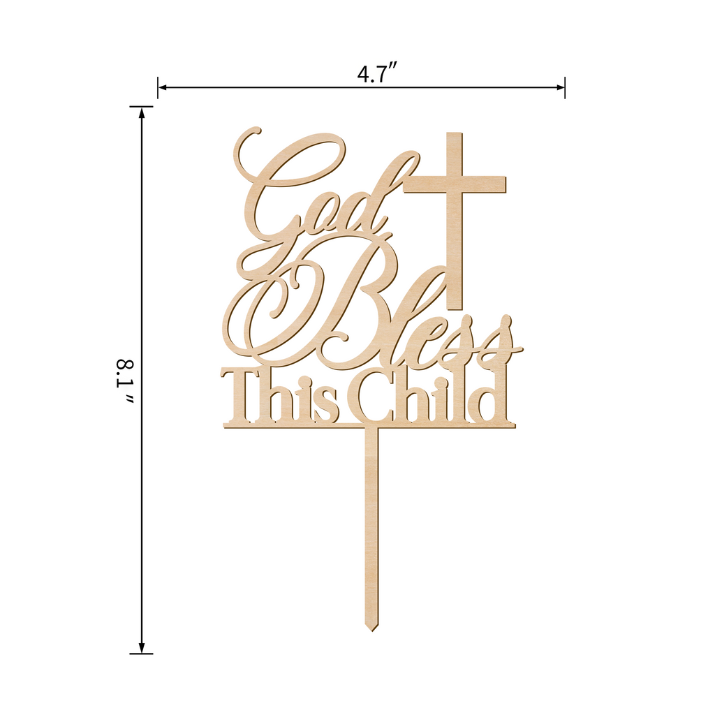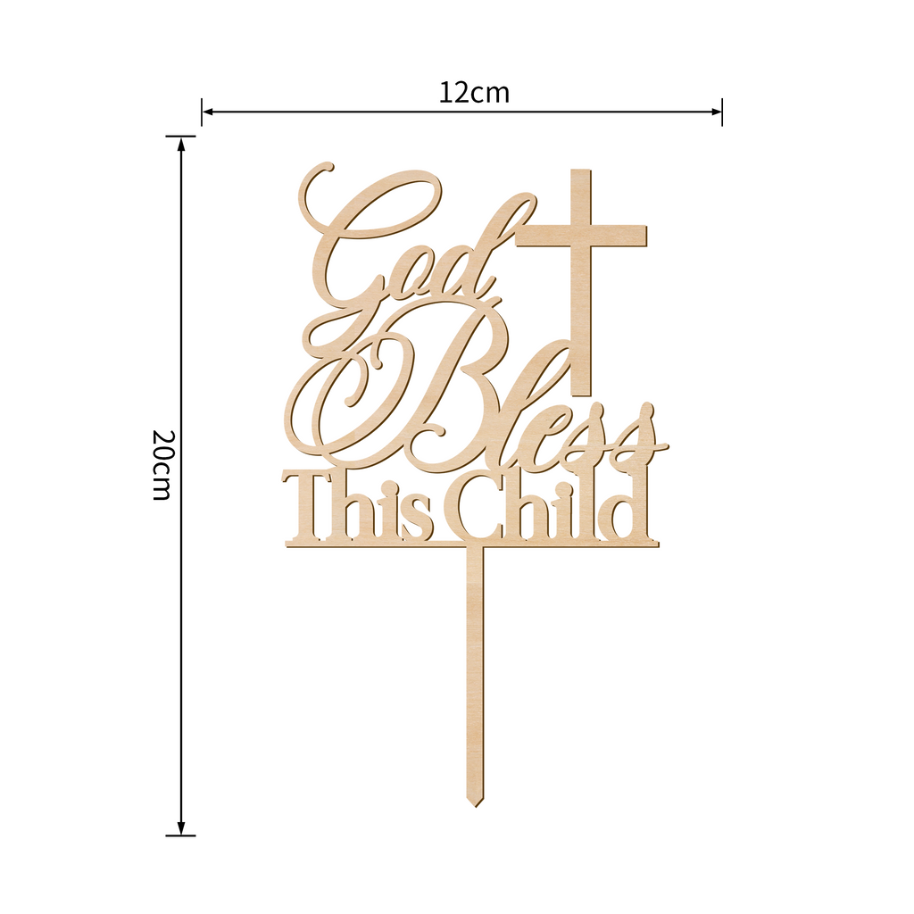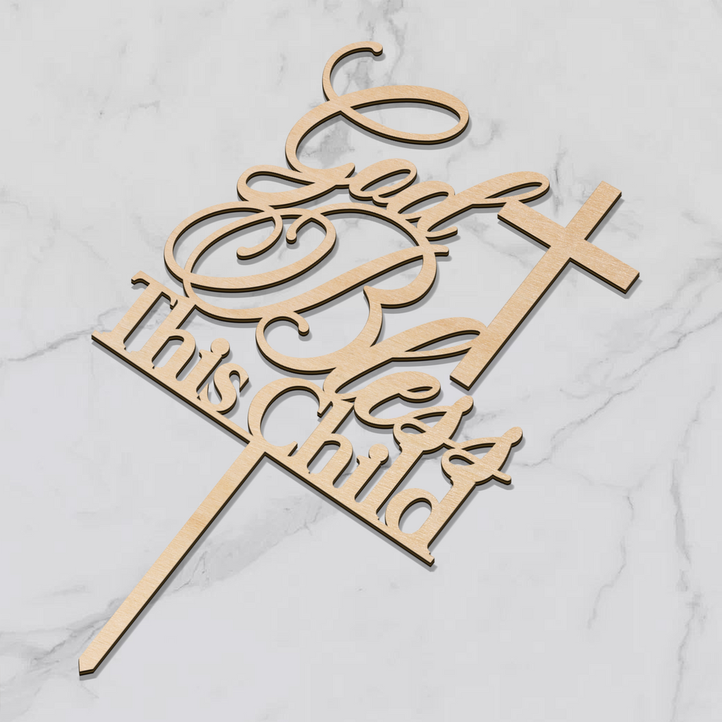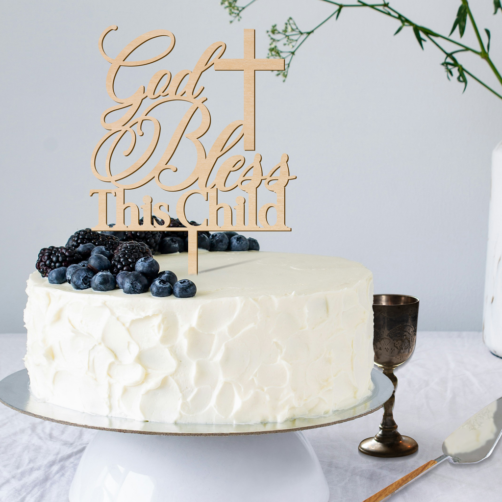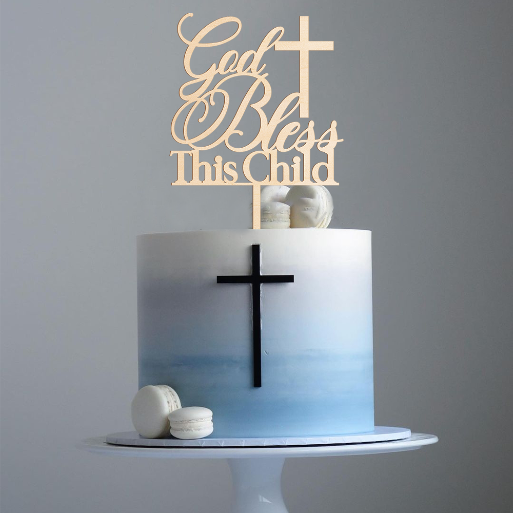 God Bless This Child Baptism Cake Topper in Wood with Solid Cross Design