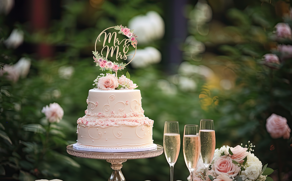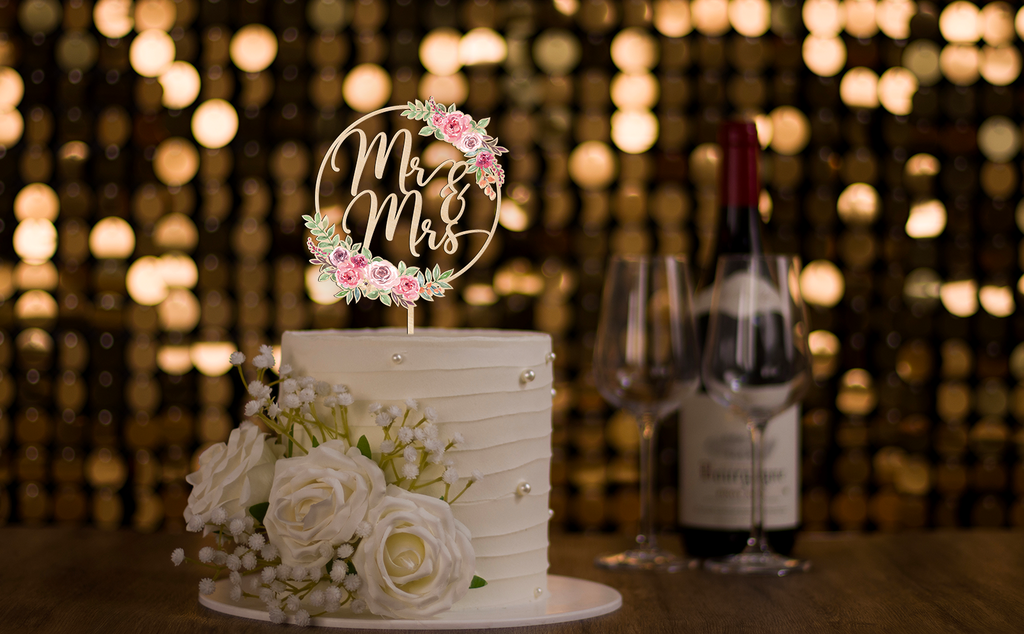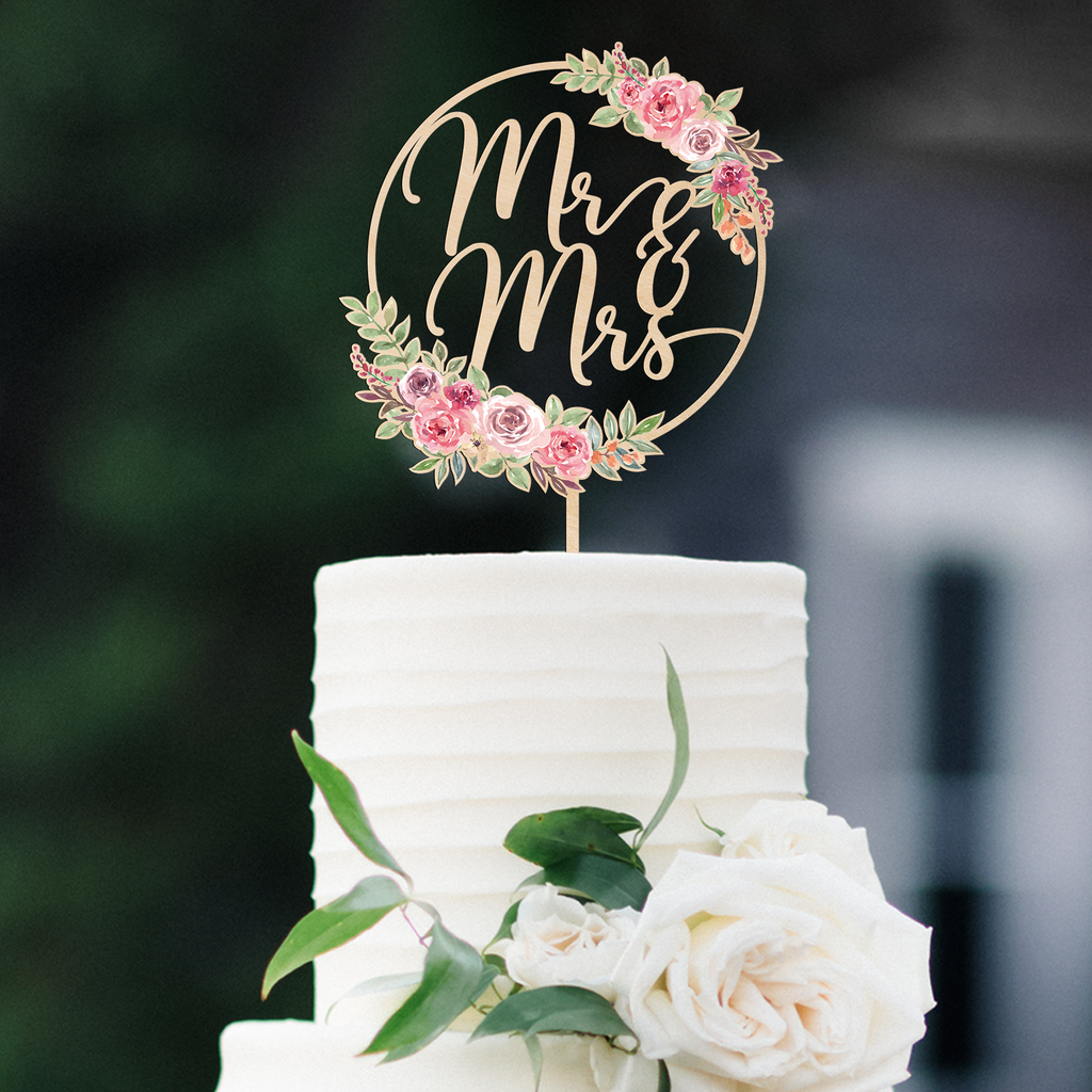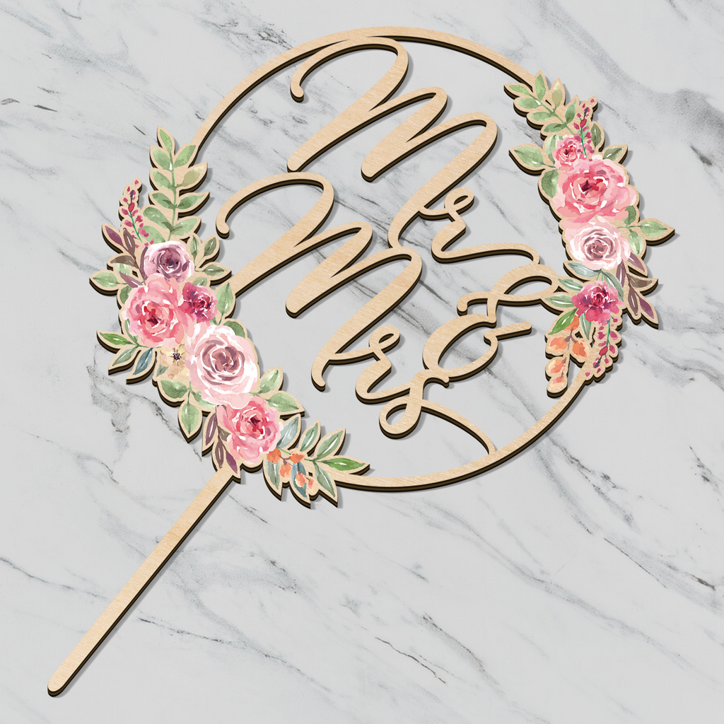 Mr & Mrs Wedding Cake Topper in Wood with Pink Floral Design