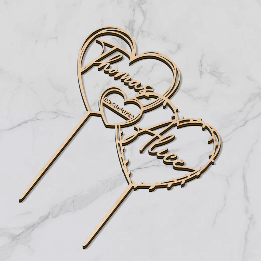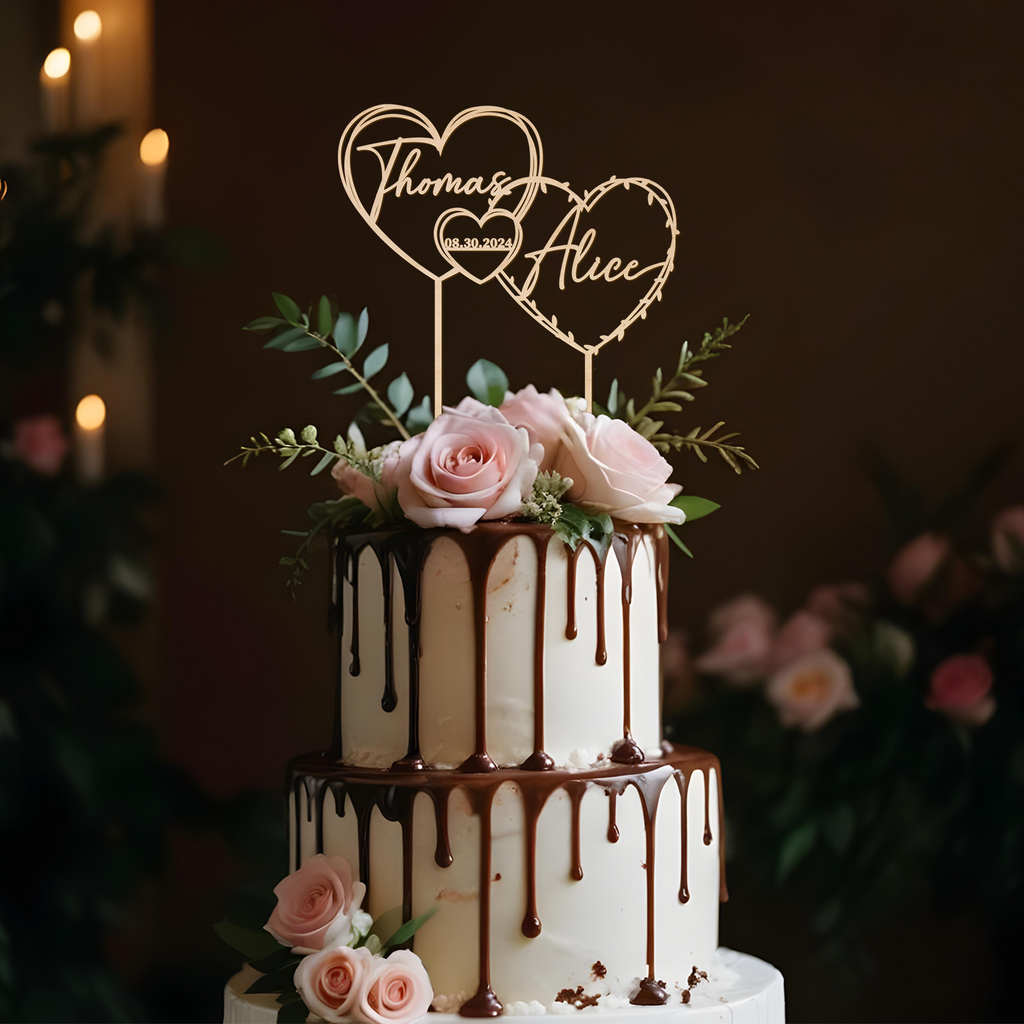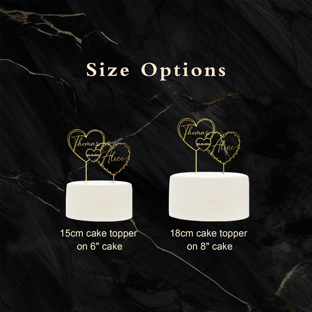 Elevate your cake with our personalized 'Hearts' wedding cake topper, crafted from premium acrylic/wood. This elegant topper features your custom names and wedding date, beautifully crafted to add a personal touch to your celebration. Its timeless design ensures it will complement any wedding theme, making it a cherished keepsake for years to come.
