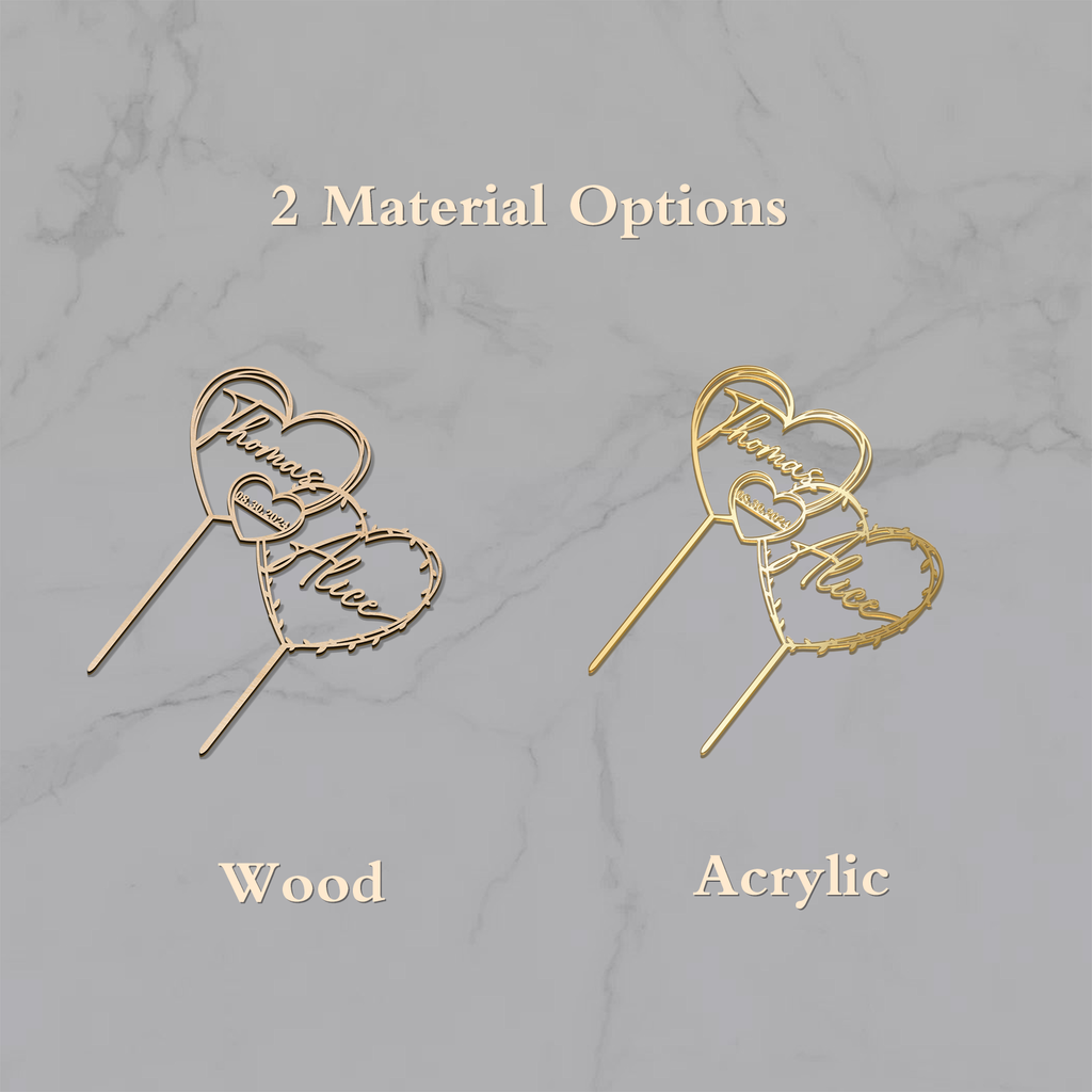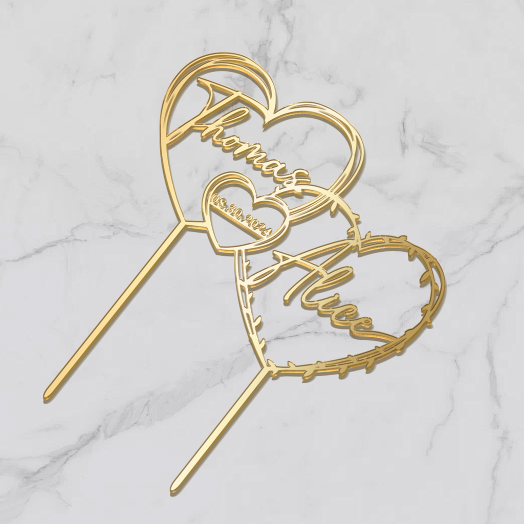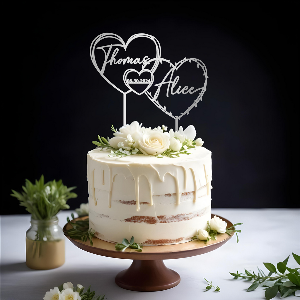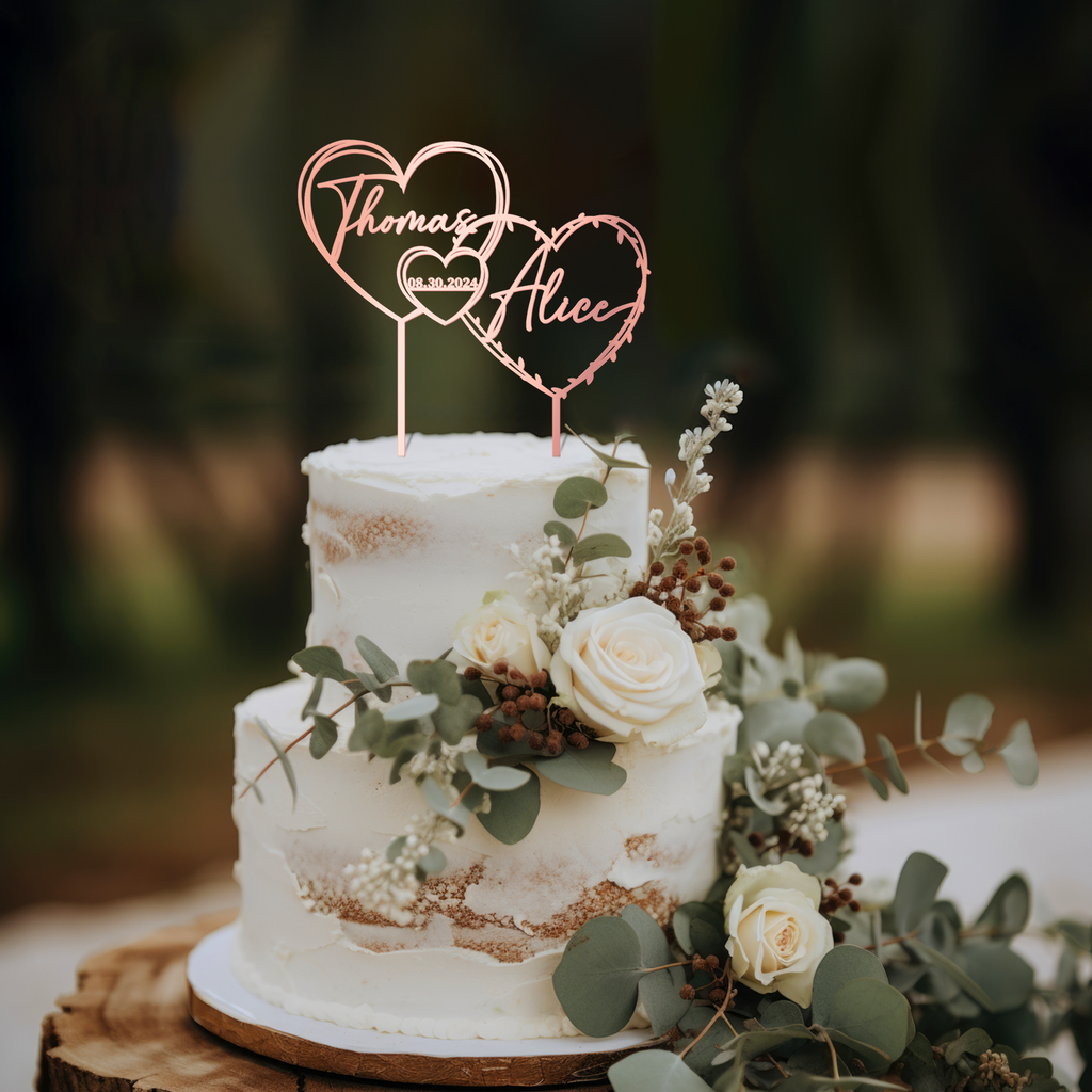 Elevate your cake with our personalized 'Hearts' wedding cake topper, crafted from premium acrylic/wood. This elegant topper features your custom names and wedding date, beautifully crafted to add a personal touch to your celebration. Its timeless design ensures it will complement any wedding theme, making it a cherished keepsake for years to come.