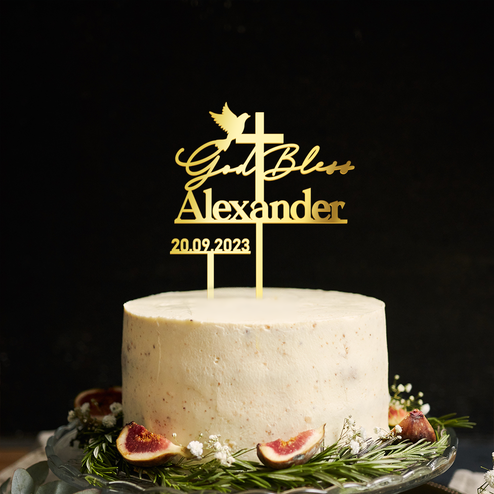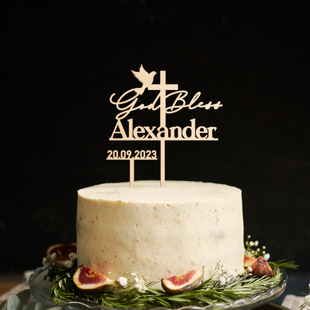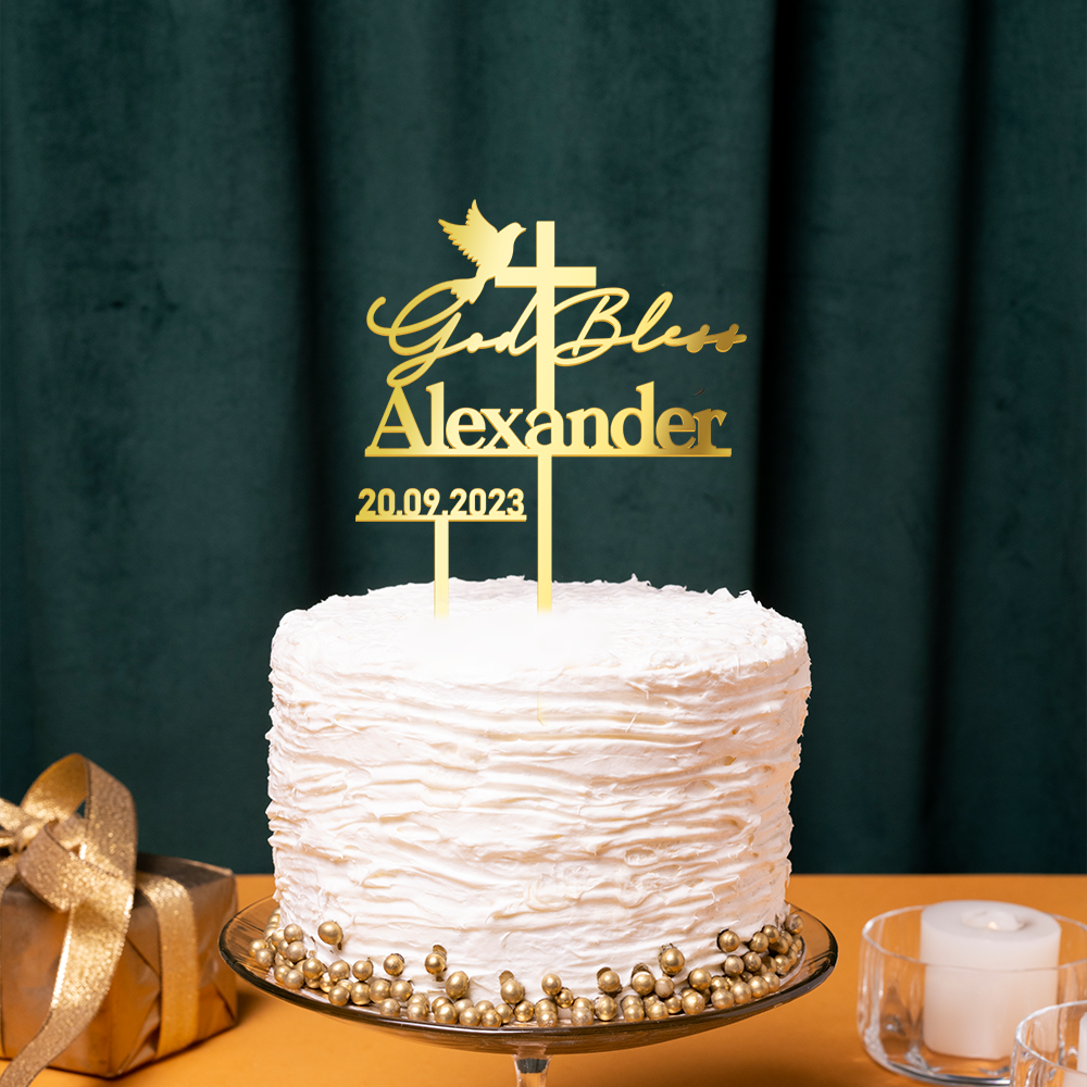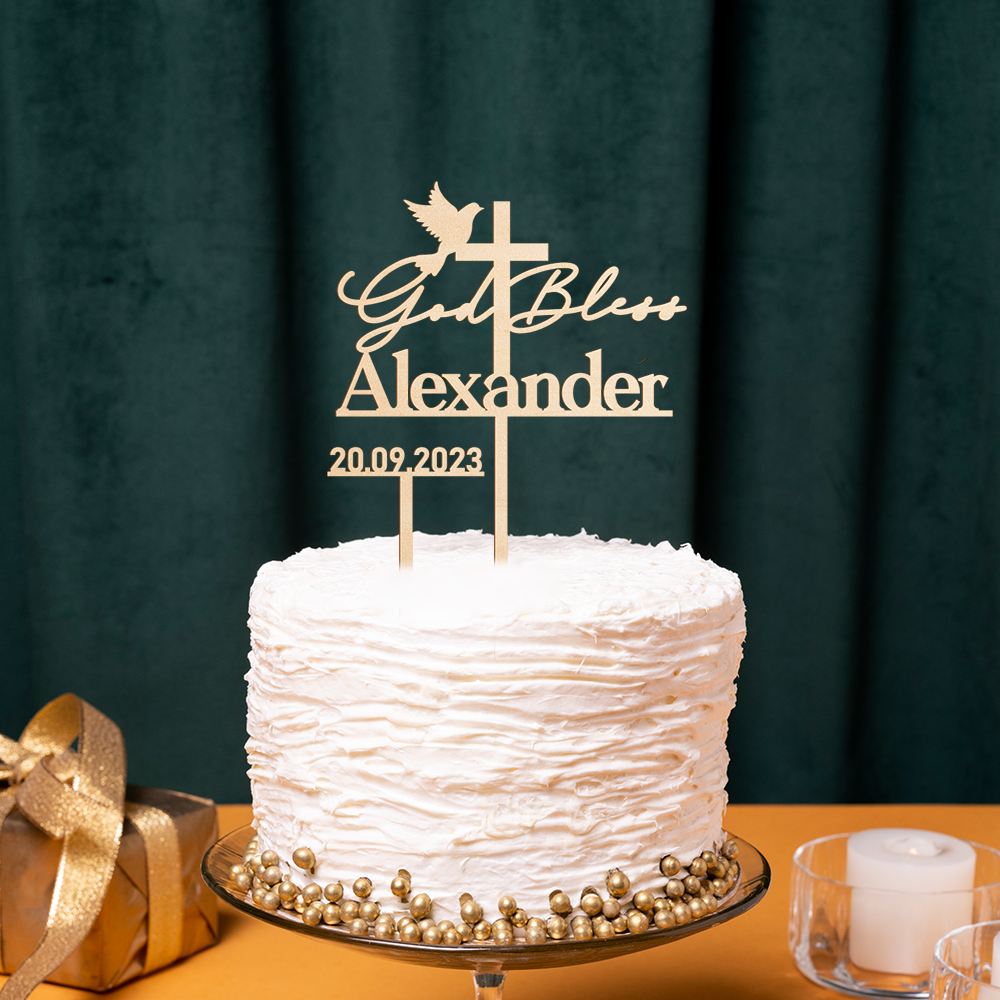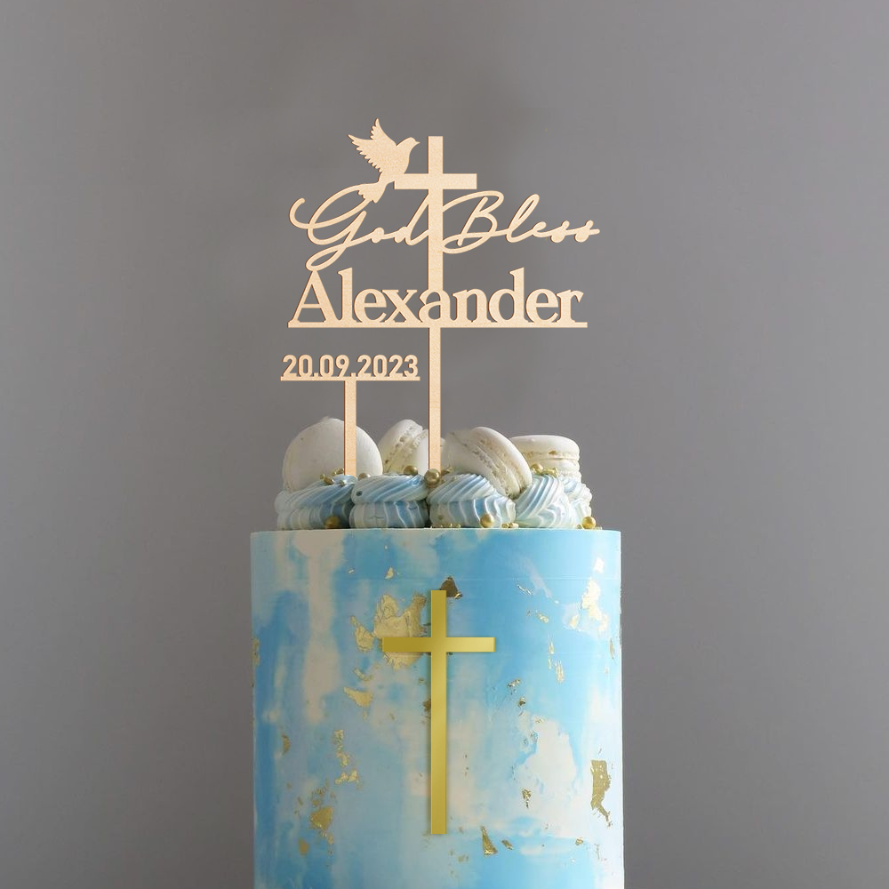 Personalized God Bless Baptism Cake Topper with Dove on Cross - Custom Name and Date
