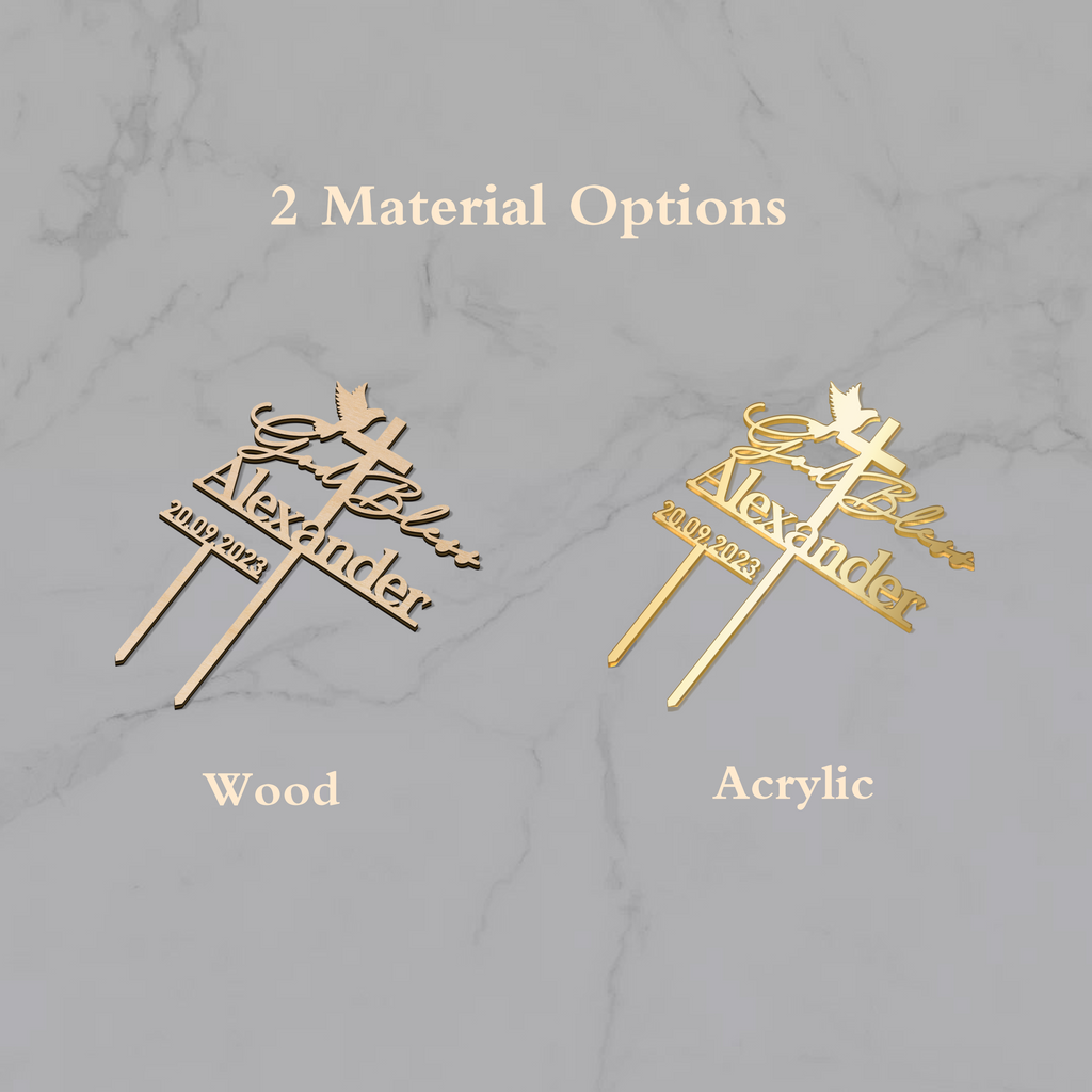 Make your sacred occasion unforgettable with our Personalized God Bless Cake Topper. Designed to feature your custom name and date, this elegant acrylic/wood topper adds a personal touch to your celebration. Perfect for baptisms, christenings, or other religious milestones, its timeless design enhances your cake and beautifully commemorates your special day.