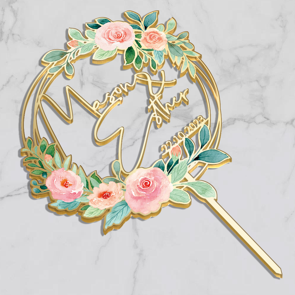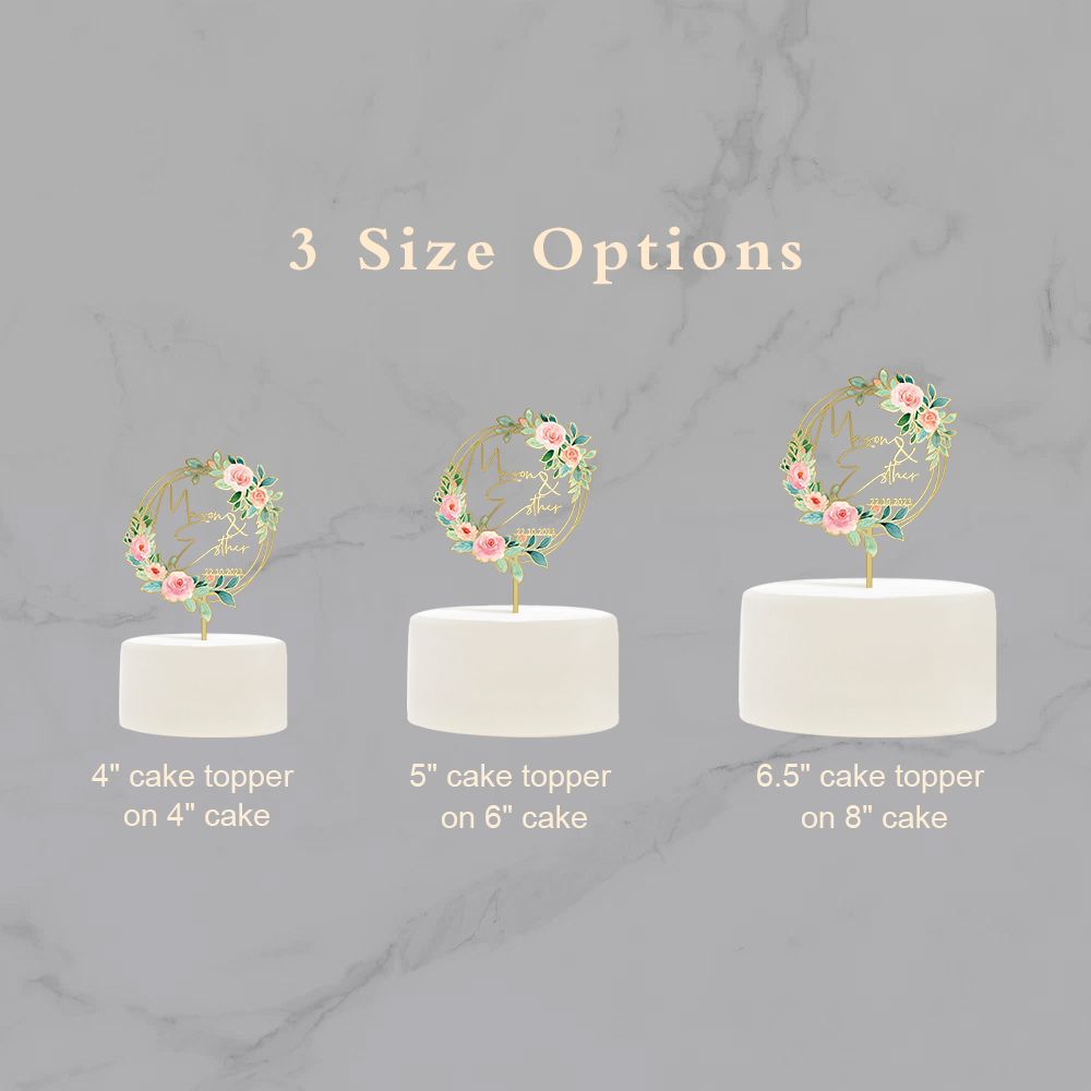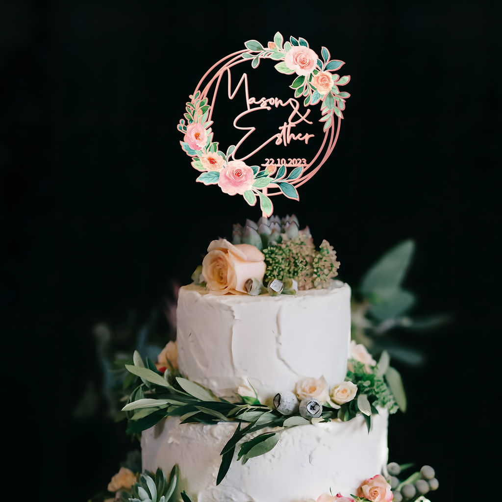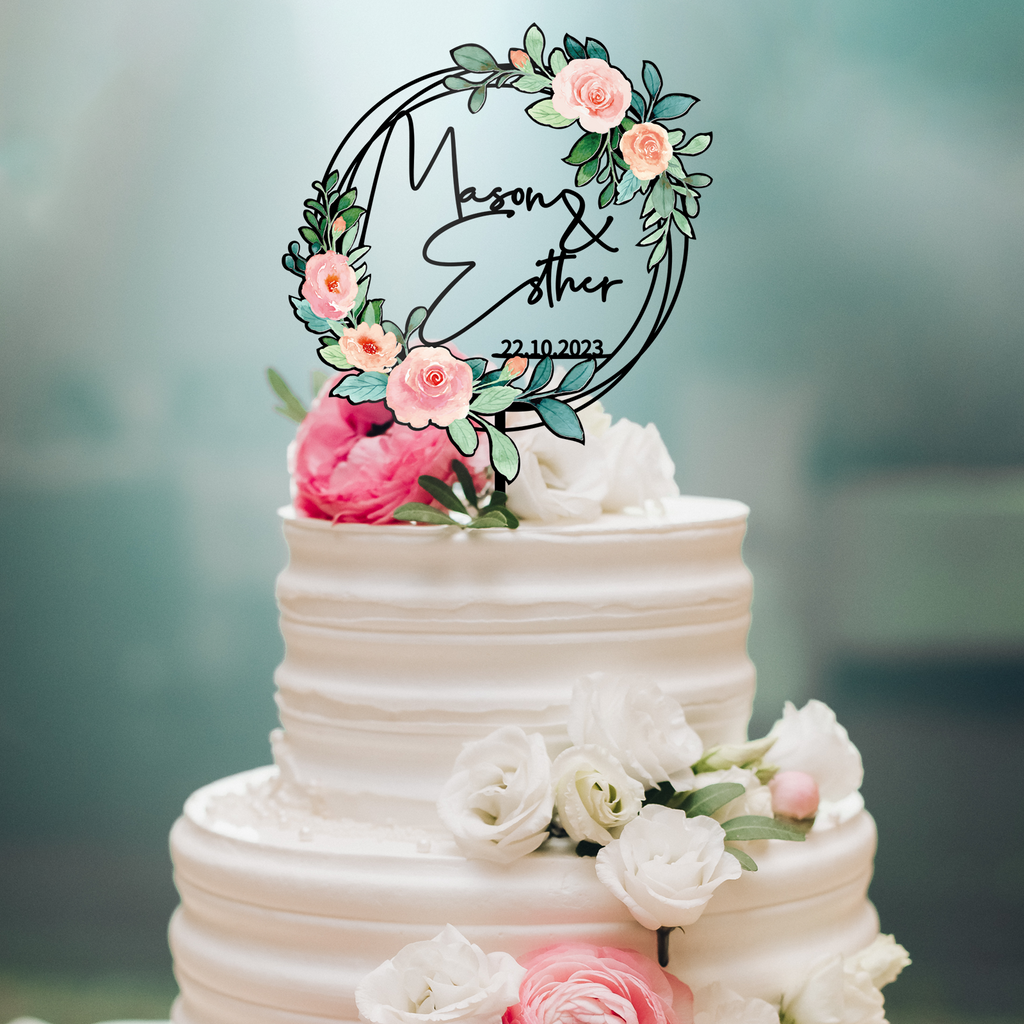 Celebrate your special day with our personalized acrylic cake topper with pink floral design. Crafted with care, this unique piece features your names and date, adding a touch of elegance and a personal touch to your celebration. Perfect for wedding, anniversaries, engagement or any memorable occasion.