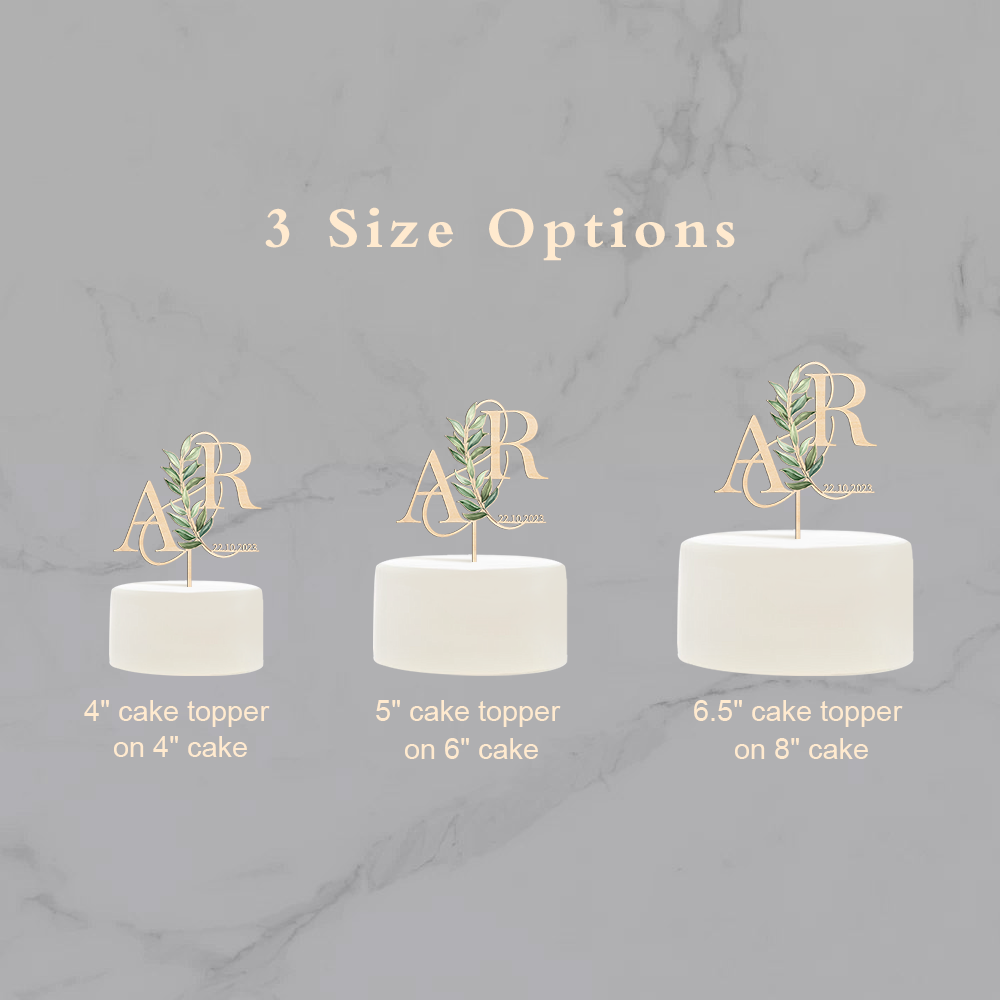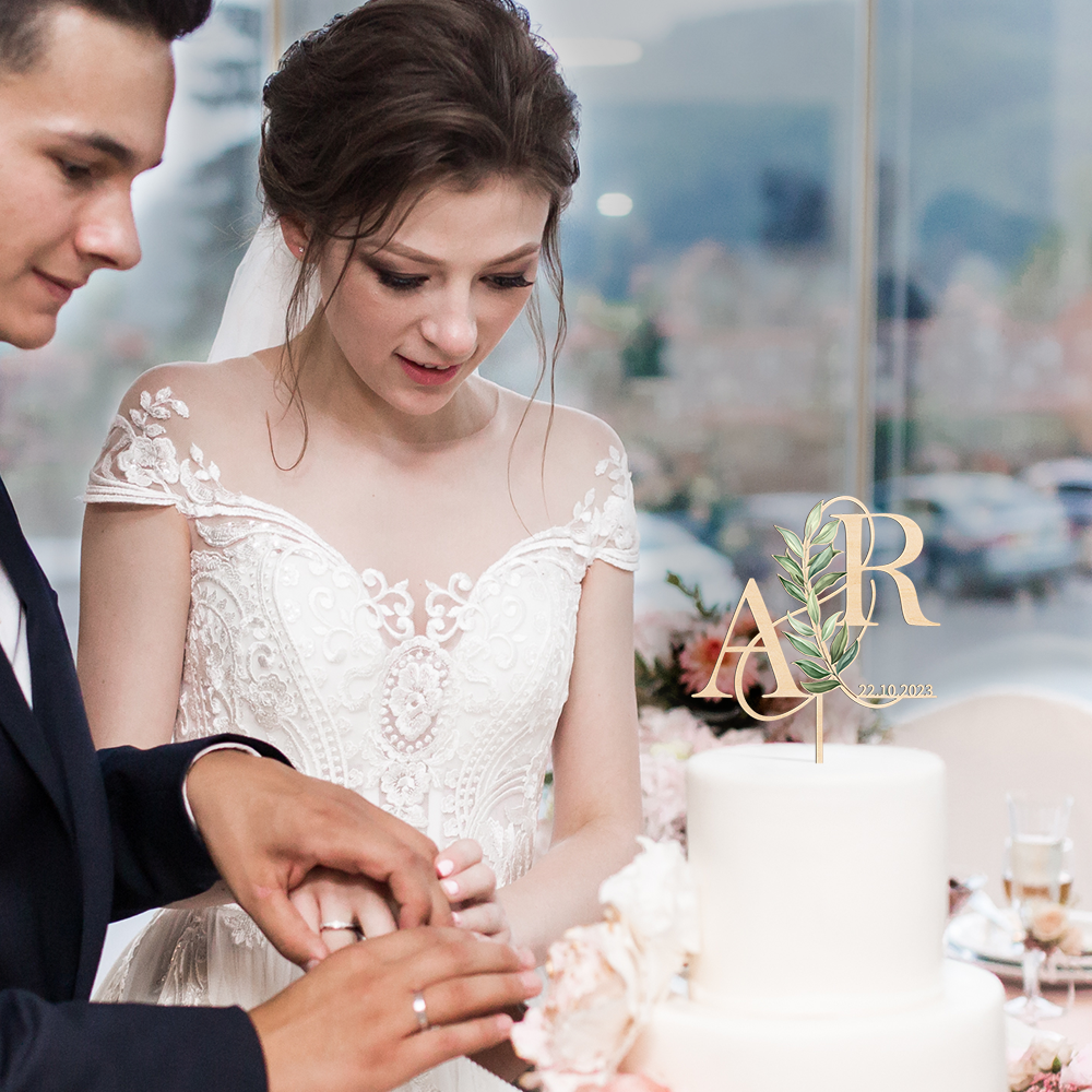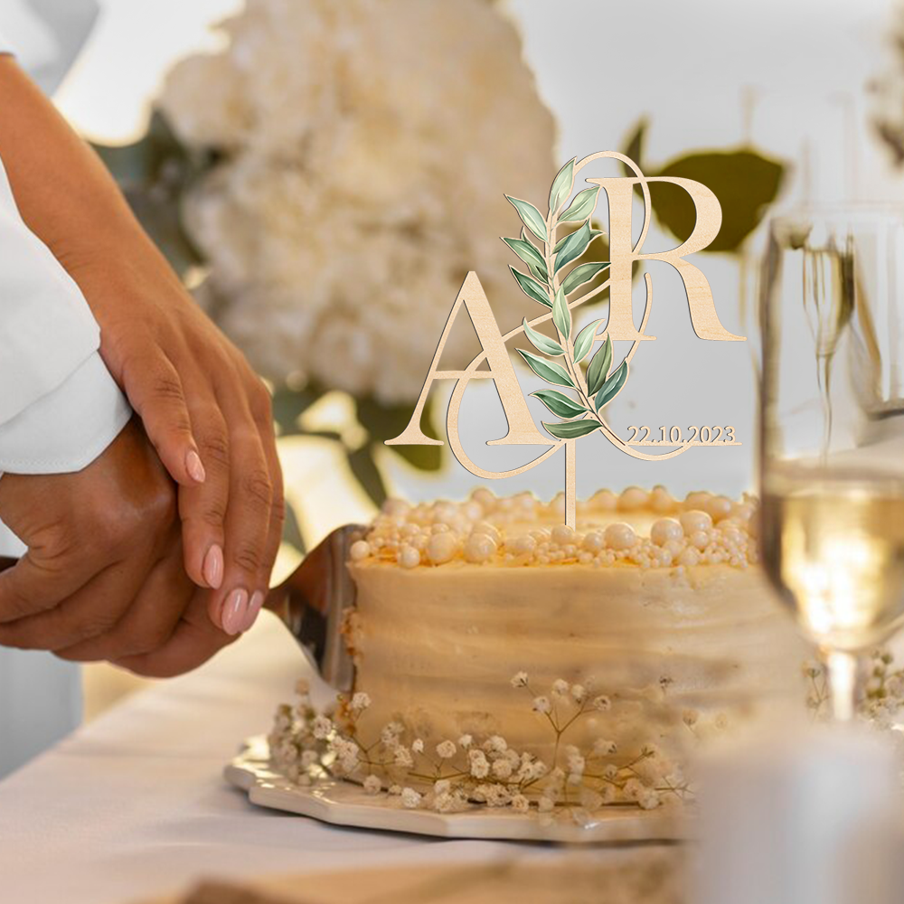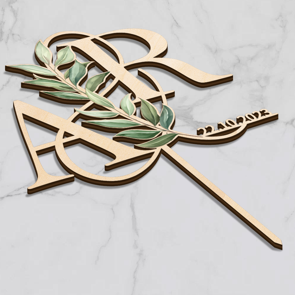Celebrate your special day with our personalized wooden cake topper with green leaves design. Crafted with care, this unique piece features your initials and date, adding a touch of elegance and a personal touch to your celebration. Perfect for wedding, anniversaries, engagement or any memorable occasion.