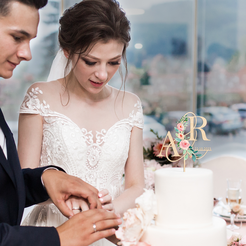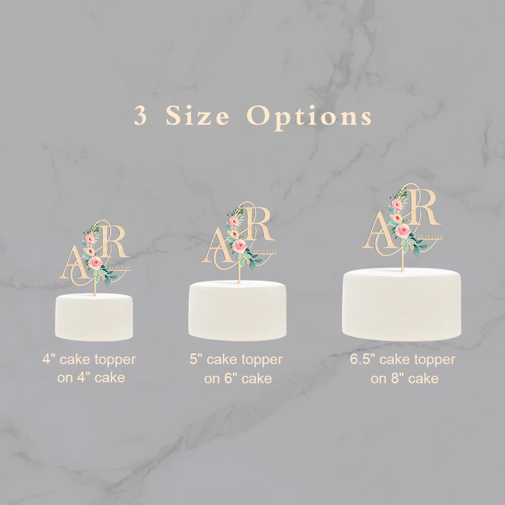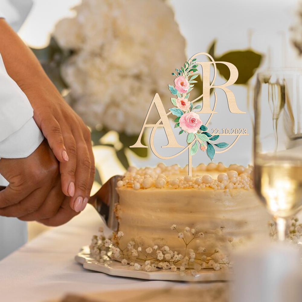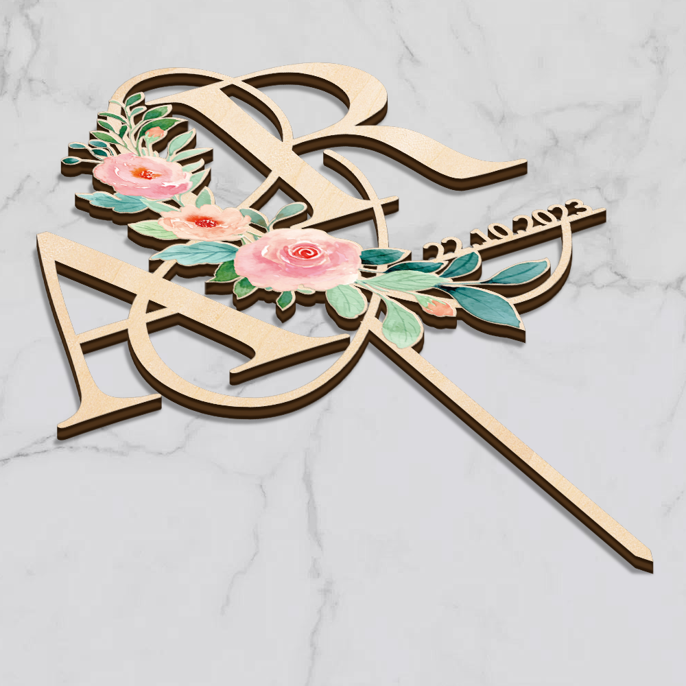 Celebrate your special day with our personalized wooden cake topper with pink floral design. Crafted with care, this unique piece features your initials and date, adding a touch of elegance and a personal touch to your celebration. Perfect for wedding, anniversaries, engagement or any memorable occasion, this exquisite topper transforms your cake into a cherished centerpiece.