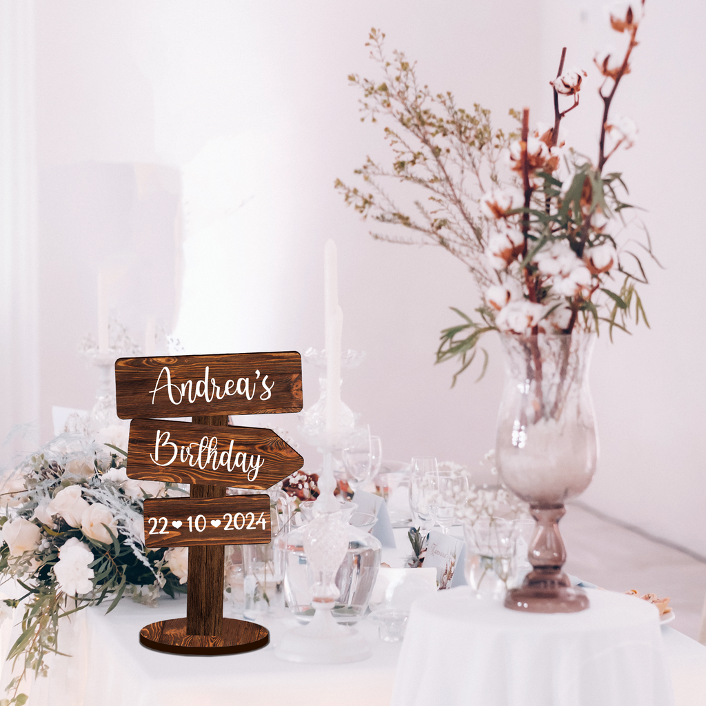 Celebrate your special day with our personalized wooden rustic table sign. Crafted with care, this unique piece features your name and date, adding a touch of rustic style to your celebration. This exquisite sign makes your event truly unforgettable.