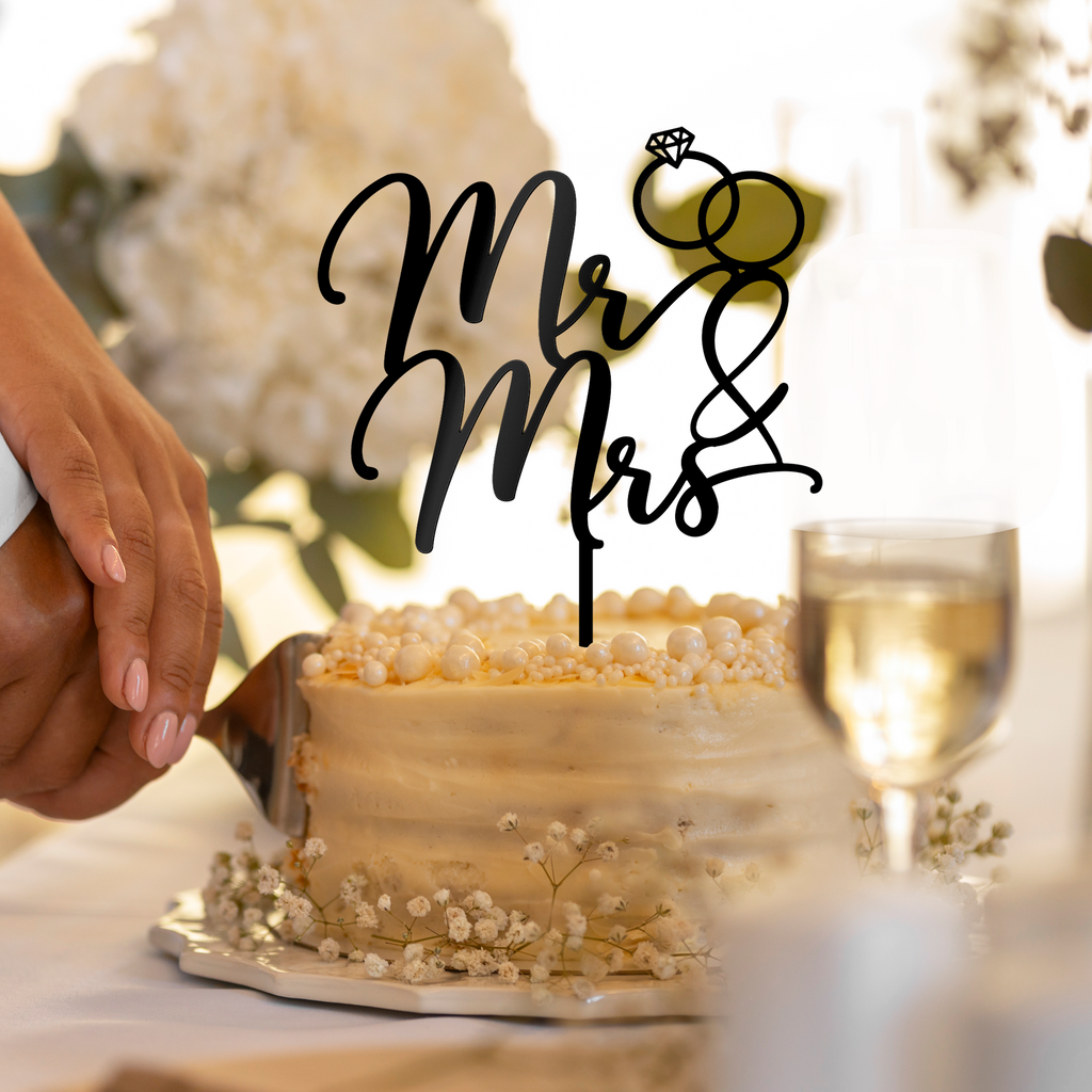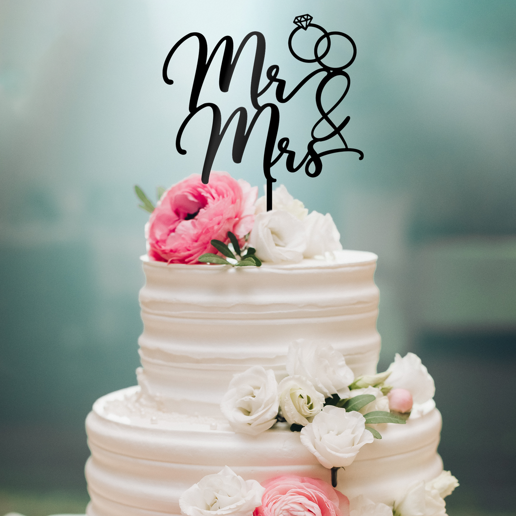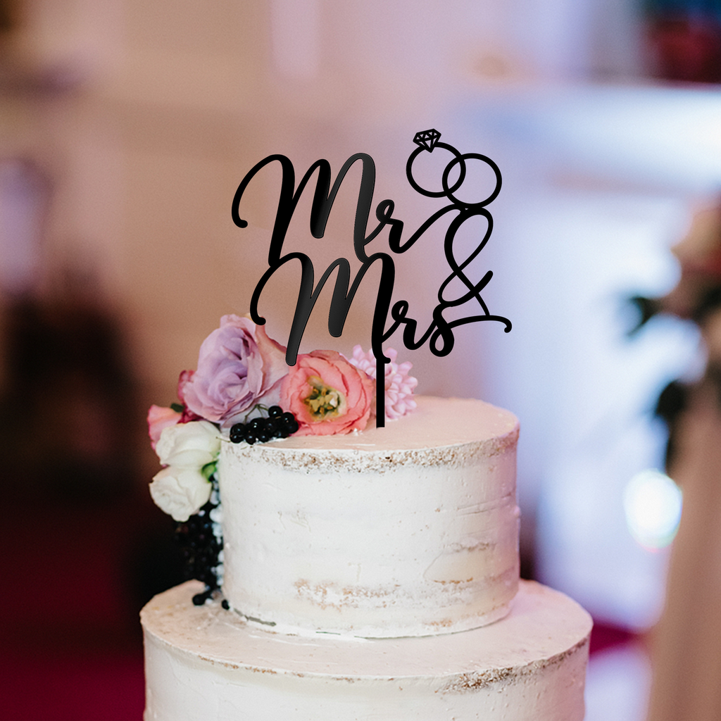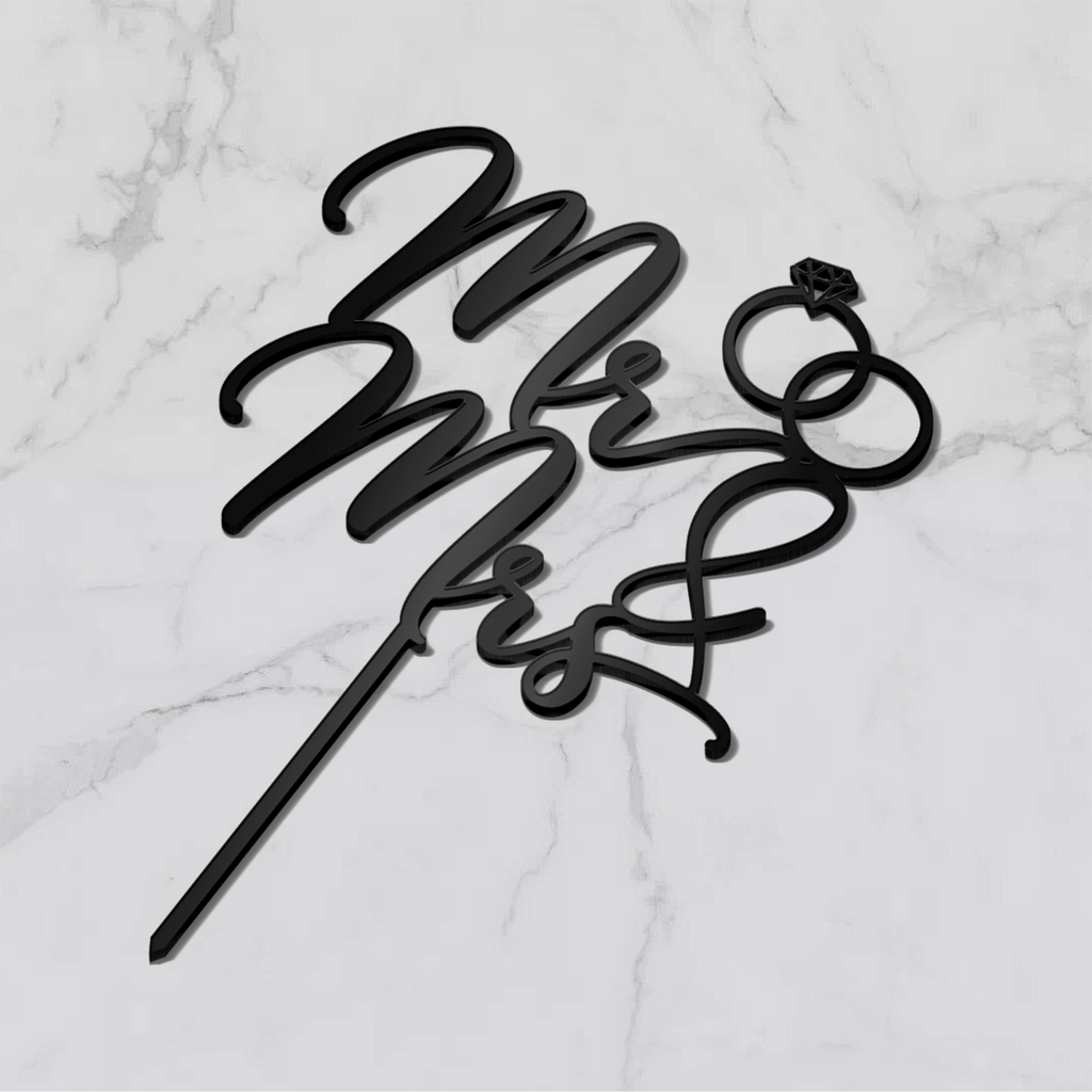 Mr & Mrs Wedding Cake Topper in Black Acrylic with Couple Ring Design 2