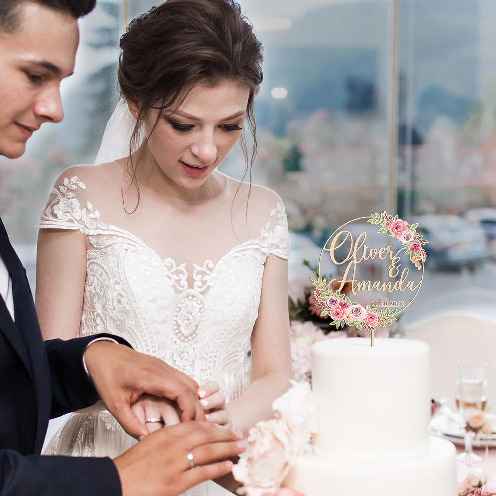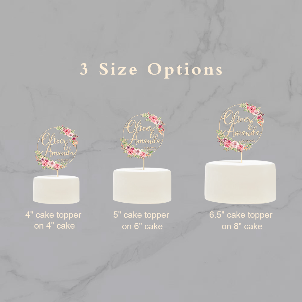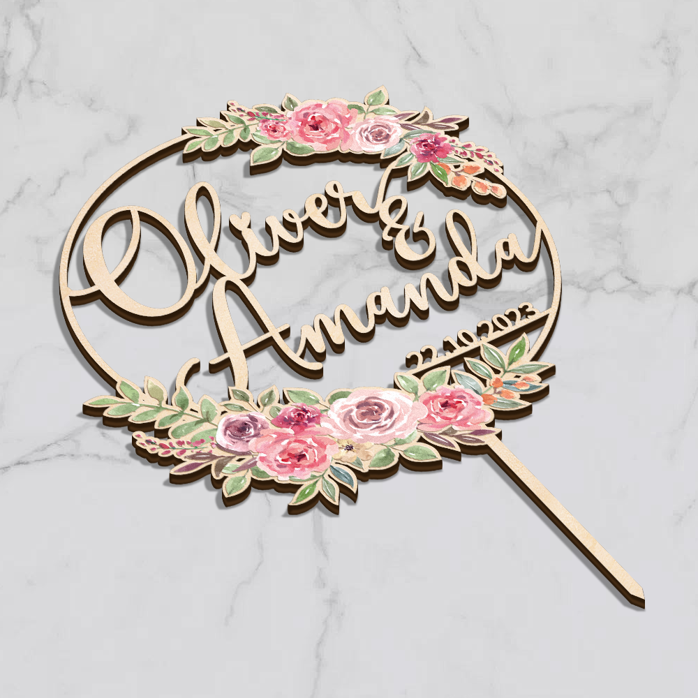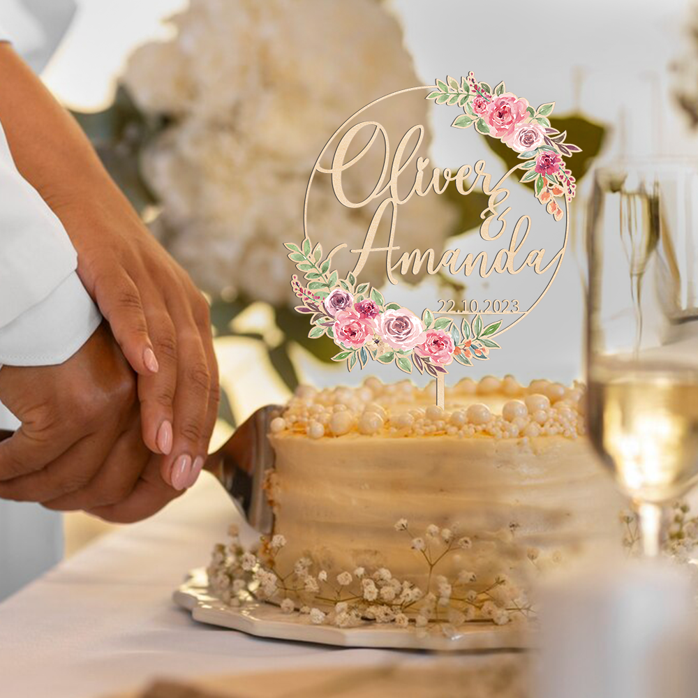 Celebrate your special day with our personalized wooden cake topper with pink floral design. Crafted with care, this unique piece features your names and date, adding a touch of elegance and a personal touch to your celebration. Perfect for wedding, anniversaries, engagement or any memorable occasion, this exquisite topper transforms your cake into a cherished centerpiece.