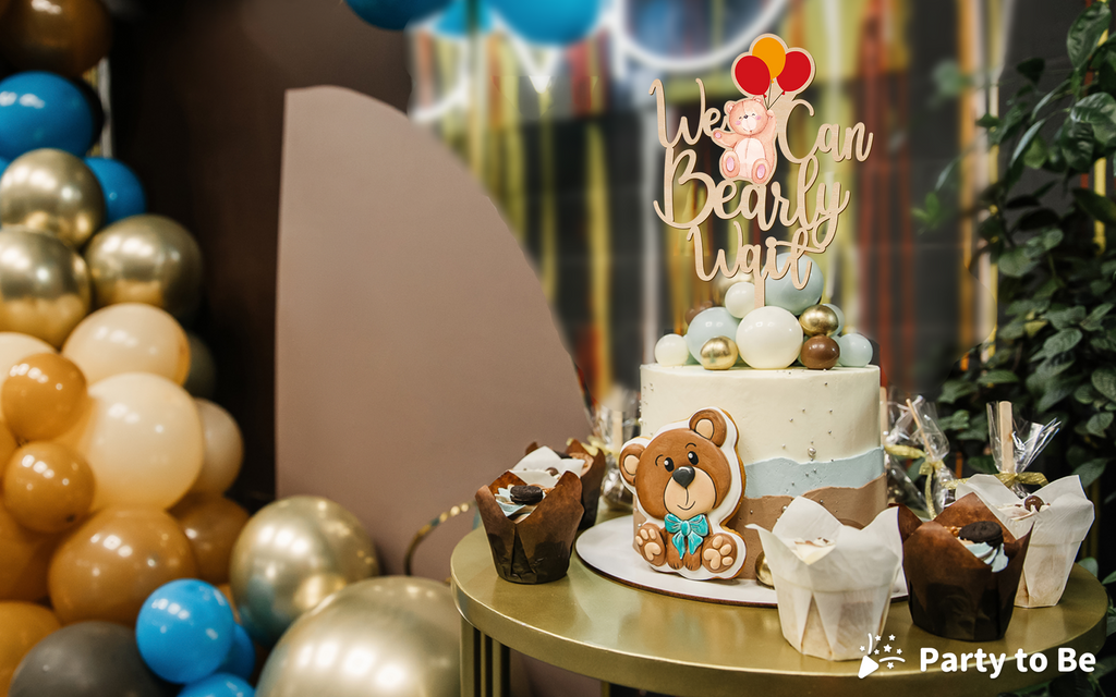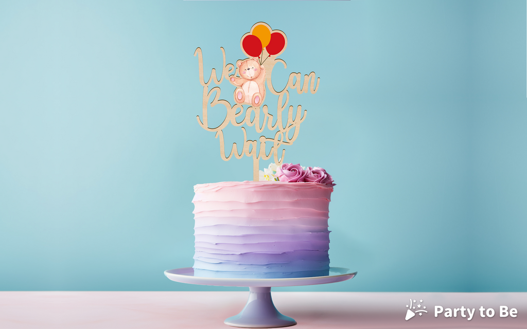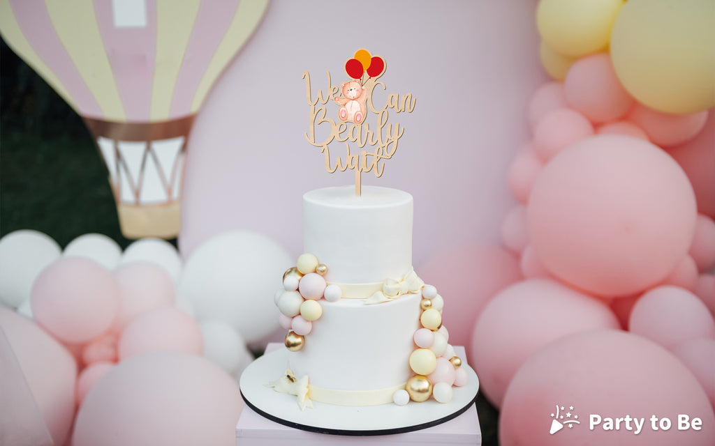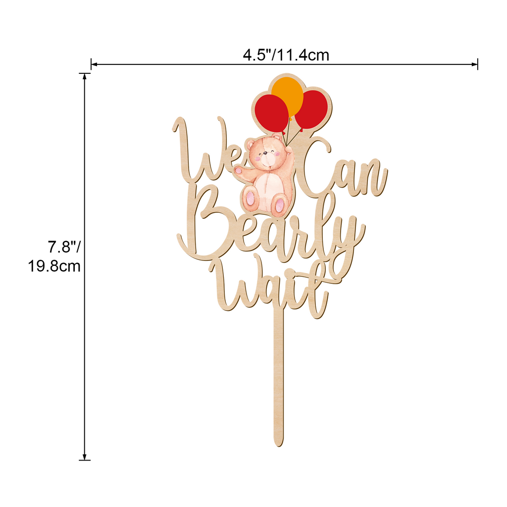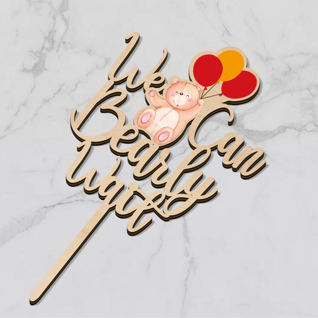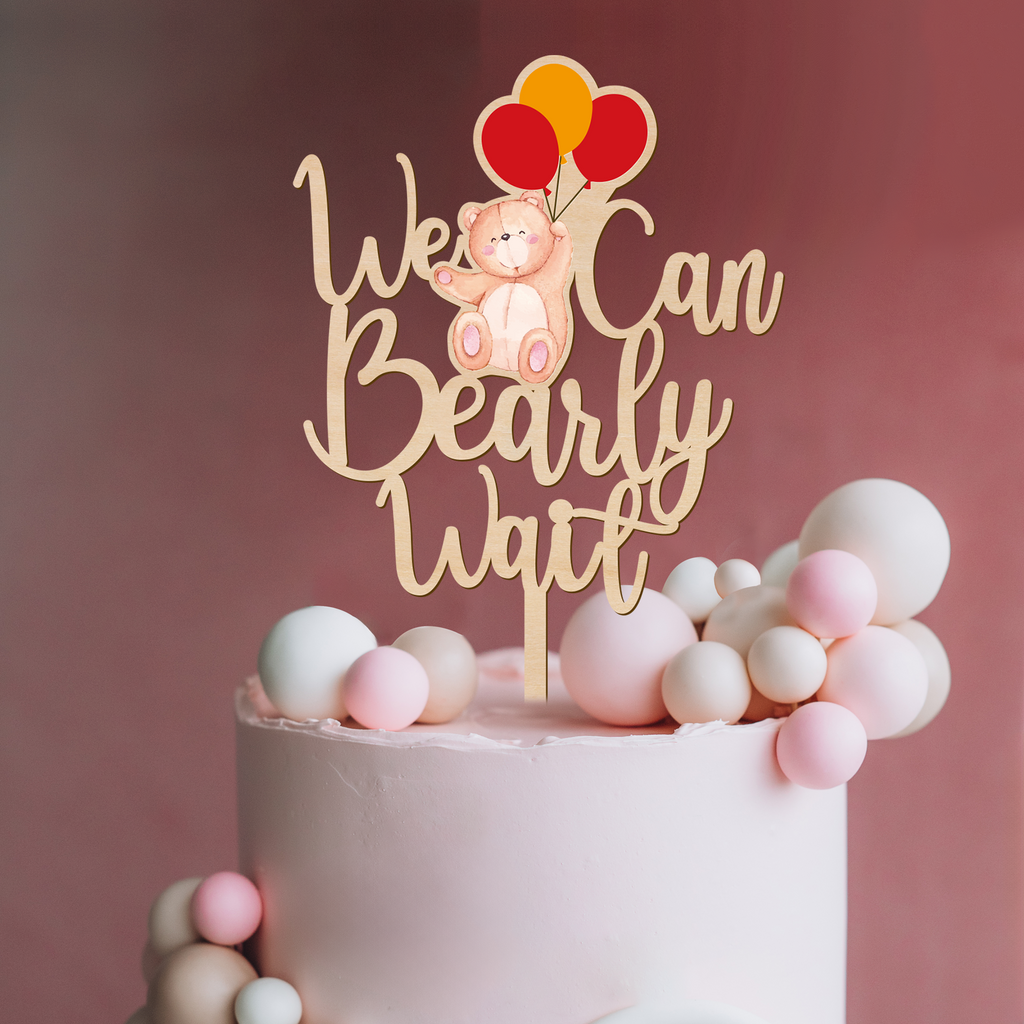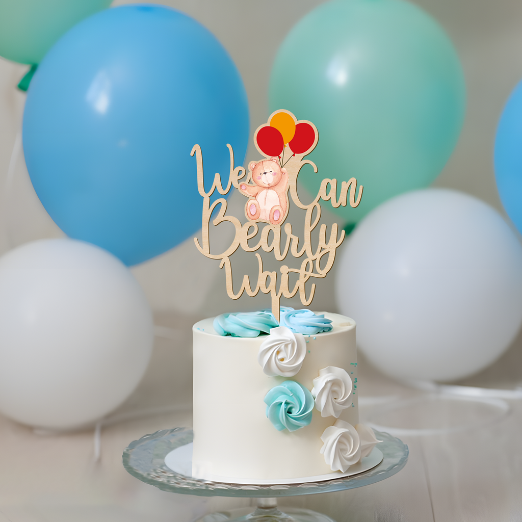 We Can Bearly Wait Wooden Cake Topper with Bear & Balloons Design